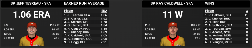 With a month to go, the Montreal Mounties, a franchise that has never been to the World Series, is holding its 5 game lead. Ironically, it is not Grover Cleveland Alexander leading them to a pennant. Alexander has had a subpar career compared to his MLB career but a torn labrum still has him out. He may be back just in time for the final week. Instead it has been Hippo Vaughn and (surprisingly) a guy named Wallace Ashley, who never made the MLB majors, leading the pitching. Ashley is 25-9 with a 1.94. George Sisler and Fred Nicholson have been driving in the runs.