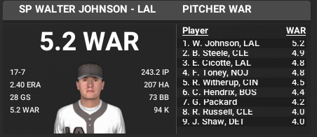 After a couple down years and a trade that sent him to Los Angeles, Walter Johnson is back this year leading the majors in pitcher's WAR through July. The 30-year-old is looking for his 5th Ace Award and potentially the first one since 1912. The Big Train has 286 wins and could have his eye on the all-time win leader, Cy Young, who leads with 388.