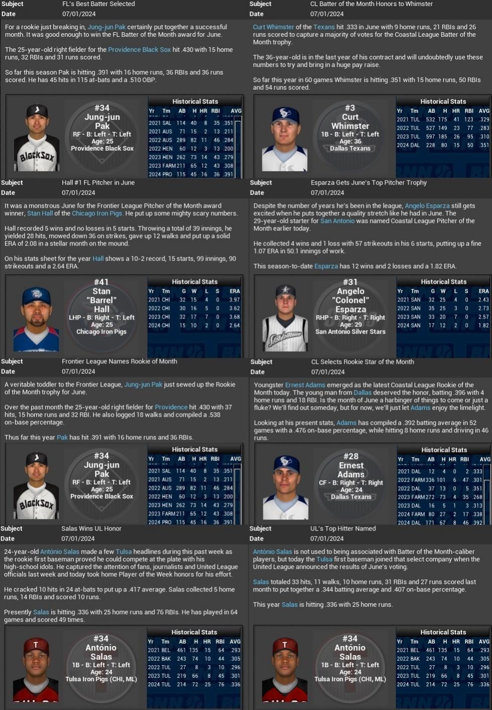 RECORD: 6-1 SEASON: 64-19 +15.5 RUNS SCORED: 601 (58) 1st RUNS AGAINST: 355 (24) 2nd OWNERS MOOD: Ecstatic (+1) FAN LOYALTY: 91/100 UPCOMING SCHEDULE: 4 vs Columbus/3@ Dayton 6/24 CHI 12 COL 1 W-Morgan (8-7) L-Abreu (4-2) HR COL-Tanner (22) CHI-Chavez 2 (18) Shaw 2 (16) Grueter (19) Hudson (23) Morgan 6-3-1-1-2-11 Chavez 3-4 3 HR's 3 runs 2 RBI's (51) Shaw 2-5 HR 3 runs 2 RBI's (54) Grueter 4-5 2B (20) HR 4 RBI's (70) 6/25 CHI 7 COL 4 W-Trujillo (11-2) L-Barnes (7-5) S-Cruz (21) HR NONE Trujillo 6.1-7-3-2-1-6 Hudson 3-5 (.397) Chavez 3-5 2B (16) SB (9) 3 runs (.416) Shaw 2-4 2B (17) SB (4) 2 RBI's (56) DRAFT NEWS-Jamal bin Jafar (3rd) and Patrick O'Sullivan (5th) have signed and reported to Omaha. 6/26 COL 3 CHI 2 W-Gonzales (6-5) L-Pimentel (12-1) S-Holt (19) HR NONE IT'S OVER! He went 7-7-3-3-4-9 on 125 pitches but the tying run was left standing on 2nd in the 9th. Mangin (COL) 3-3 2B (14) STUFF-And what is likely to stand up for the history of the IBL, Gabriel Pimentels win streak is halted at 33, and his undefeated streak is stopped at 47 starts. He's gone 30-1 in 43 starts since singing as a 2023 FA. 6/27 CHI 5 COL 2 W-Hall (10-2) L-Morales (9-4) HR COL-Schall (18) CHI-Cruz (16) Hall 9-9-2-2-1-10 117 pitches. Martinez 3-4 Rush 1-2 3 runs Hamlyn 2-3 2 RBI's (22) 6/28 (Halfway point) CHI 7 DAY 4 W-Bright (8-4) L-Woodroffe (6-8) S-Cruz (22) HR CHI-Cruz (17) Grueter (20) DAY-Ramos (3) Torres (17) Bright 7-4-2-2-4-5 Grueter HR 3 RBI's (73) Ramos (DAY) 3-4 2B (11) HR RBI (14) 6/29 CHI 16 DAY 3 W-Morgan (9-7) L-Zamora (8-5) HR CHI-Grueter 2 (22) Miranda (10) Morgan 7-7-3-2-1-7 Shaw 3-6 2B (18) 3 RBI's (59) Miranda HR 4 RBI's (61) Grueter 4-6 2B (21) 2 HR's 5 RBI's (78) Vela 3-6 2 2B's (11) (he's now taken over the everyday job) 6/30 CHI 9 DAY 7 W-Casas (3-0) L-S.Martinez (4-4) S-Cruz (23) HR CHI-Castro (19) Miranda (11) DAY-Torres (18) Quintania (1) Trujillo 6.1-6-4-3-4-5 Casas BS (1) in the 8th. Shaw 4-5 3 RBI's (62) WEEK 13 SUMMARY FL POTW-David Peterson (ALK) 16-27 HR 3 RBI's (.356-2-16) CL POTW-Jamie Vance (TUL) 13-29 2 HR's 7 RBI's (.316-16-60) WEEK 13 POWER RANKINGS 1) Chicago (1) 2) Fresno (-) 3) El Paso (-) 4) West Michigan (2) 5) New York (-) OUT San Antonio (6) Dallas (8) Staten Island (7) MINOR LEAGUE SUMMARY AAA Tulsa (1 +1) 58-24 +12 1st Runs/Avg/OBP/HR/RA/BP ERA 4th SB/SP ERA 5th Def Eff AA Bakersfield (9 -3) 48-34 6 GB 1st SB 2nd OBP/HR 3rd Runs 5th Defense A(S) Belleview (8 -1) 44-38 T-1st 1st AVG/SB 3rd OBP/SP ERA 5th RA A(N) Denison (9 -3) 49-33 4 GB 1st Runs/AVG/OBP 2nd HR SS Heavener (12) 4-2 T-1st T-2nd HR R Omaha (21) 3-3 T-1st 1st SB |