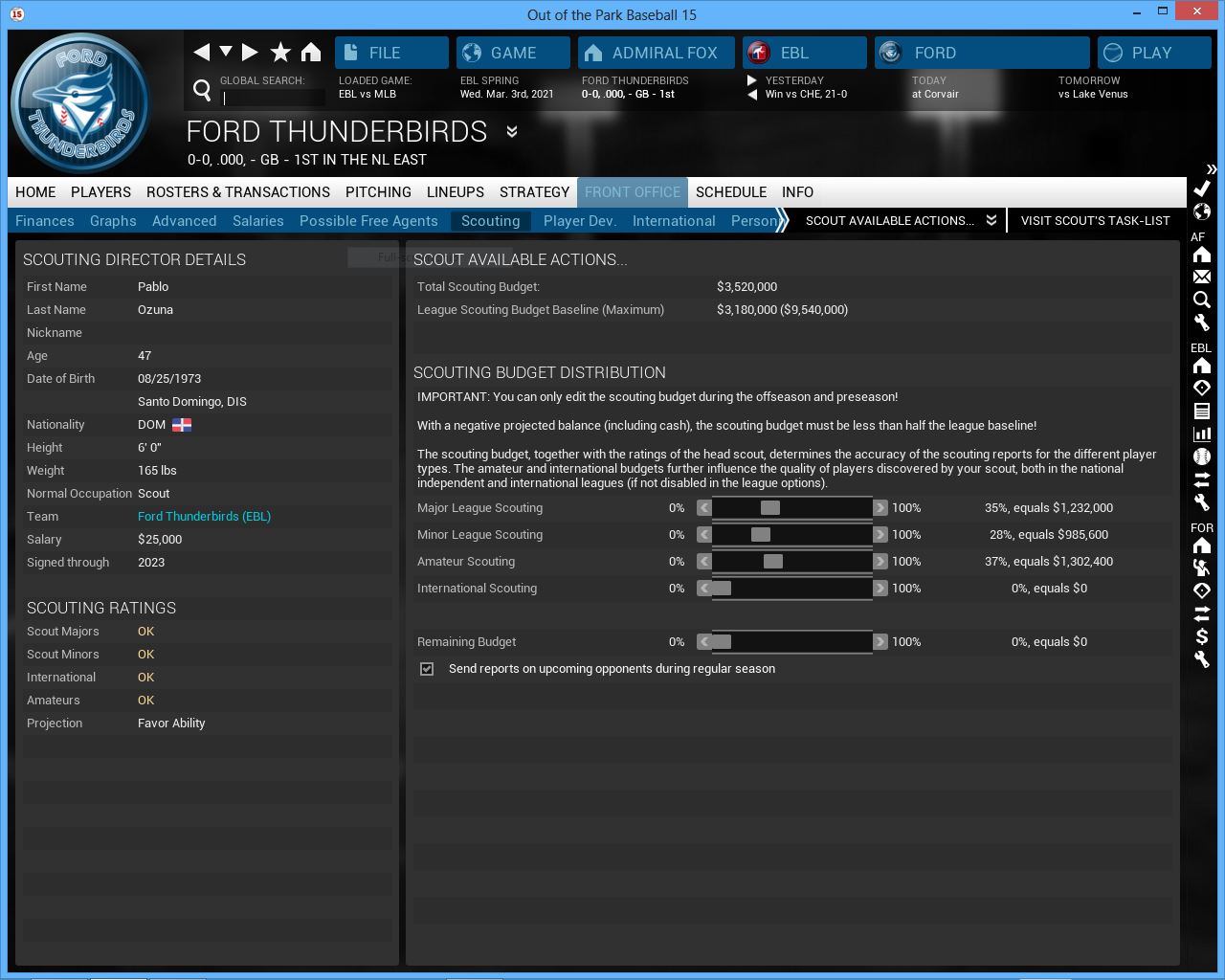 We have several position battles going into ST. SS is open spot. Overfelt vs Packer. Stacy Spear (she married Scott on Valentine's Day at the Thunderdome), Bromden, Fajous, Toni Jones, Peabosy will compete for the backup positions. Packer & Overfelt might platoon LHP for Overfelt since he hit lefties at .353 and RHP for Packer. Slight chance I might trade Overfelt at some point. CF is somewhat open between Parker & Millatone, it is up to Parker. RF is somewhat open between Burke & Kazan & Parker. Backup C is wide open with Bair, San Antonio, Maracle & Harris competing. Spear will probably catch 130 G vs the 111 starts last year. All bench spots are wide open. DH is open battle with Wyatt, Jones, Peabody & Kazan there. lefty vs righty platoon. the majority of OD starters will sit and come in late or come out early. Falcone, Mack, Pearl & Kline. Starting rotation is set although the order is not. I want to go with all 3 LHP then DeBoer then Proctor but that will be decided after ST. Pen only has 1 open spot long relief. Norm Maclean holds the edge but Paul Maclean, Ruetecki both Ackbar brothers and the rest will compete for that spot. I signed several new coaches at AA Lombard and a new SD Pablo Ozuna.