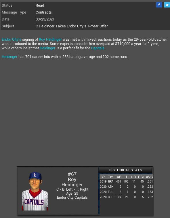 Highland Scots 3B Renato Nunez retired. St Louis Cardinals LHP Kyle Helisek will miss the entire 2021 season. Endor City signs C Roy Heidinger for 1 yr. Tampa Bay Rays MR Carlton Dukes will miss the 2021 season.