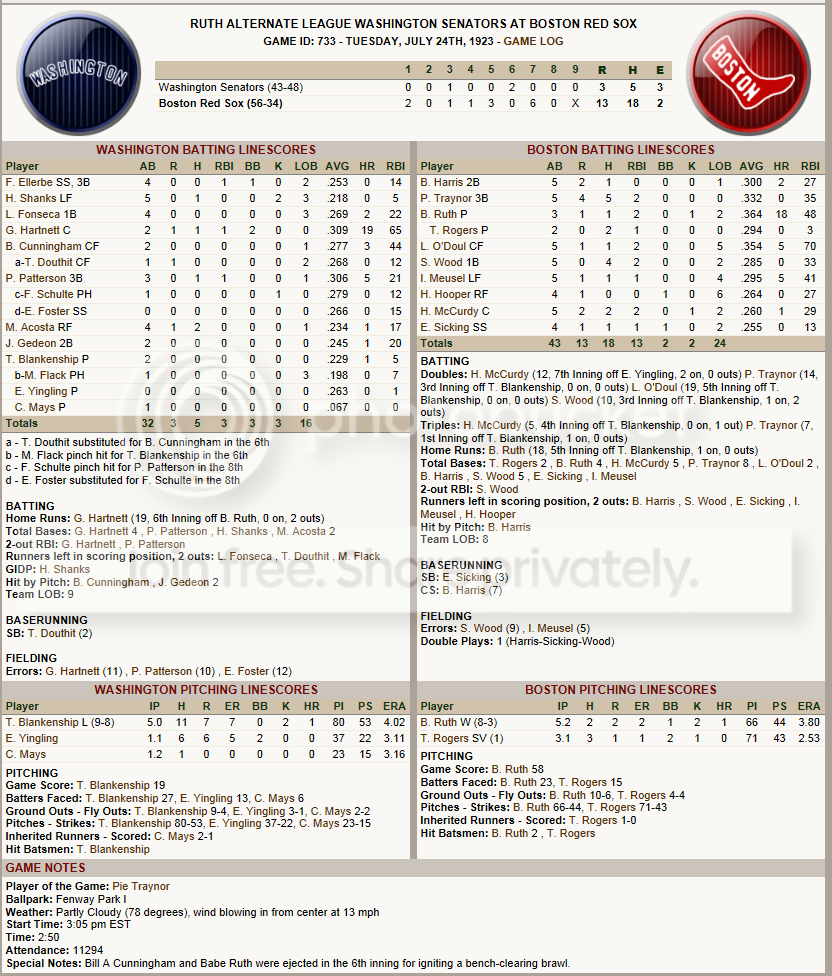 Dutch gets us another Ruth'less win The Box Score ![]() Today's Games ![]() The Boston Offense is now at full strength with the return 1B Joe Judge and C Johnny Gooch from the DL combined with the end of Babe Ruth's suspension.