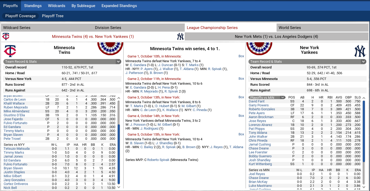 Powers rakes, but the Twinkies are too much for NYY and they move on to the WS. Girard and KJ are rocked to sleep by LAD's pitching and are bounced from the playoffs. |