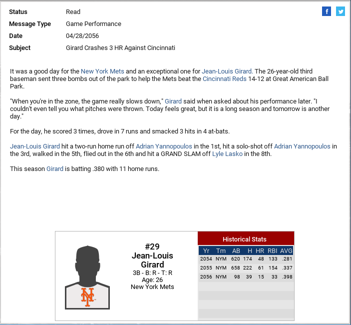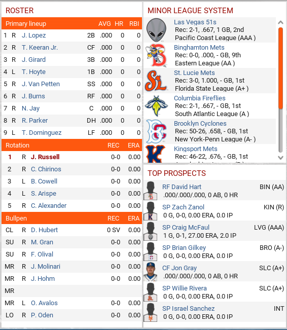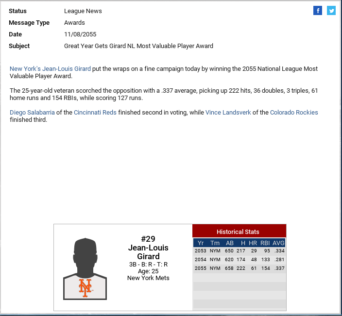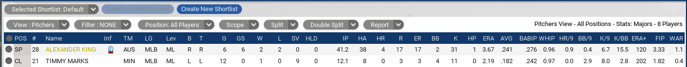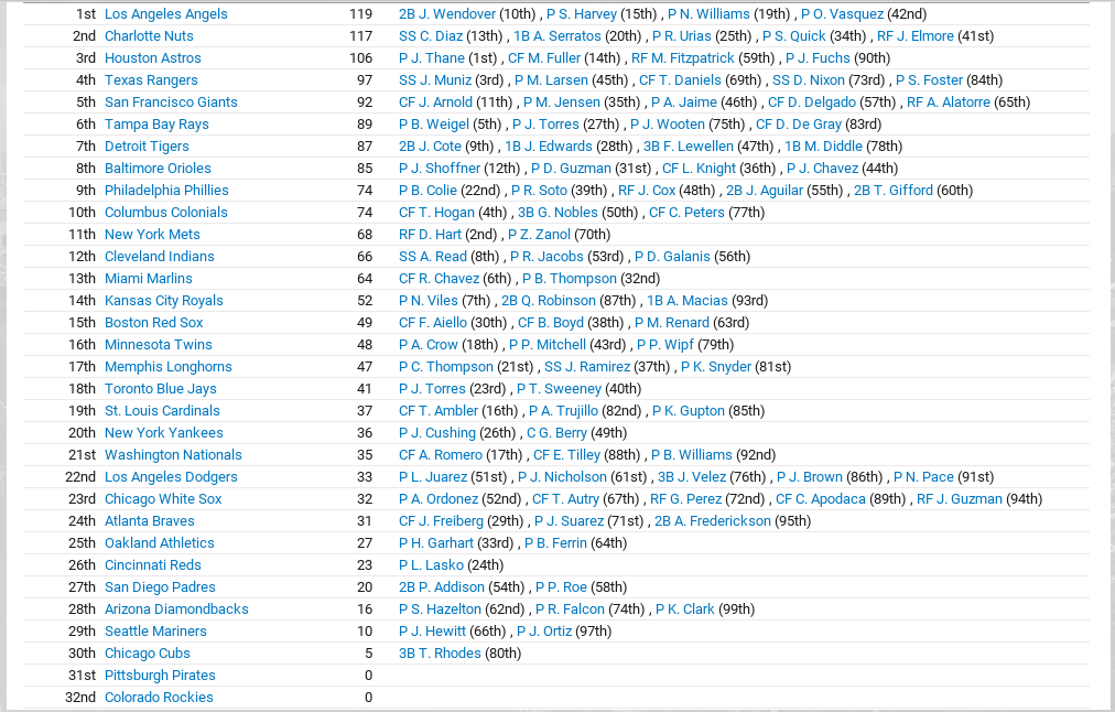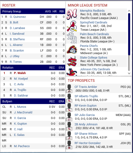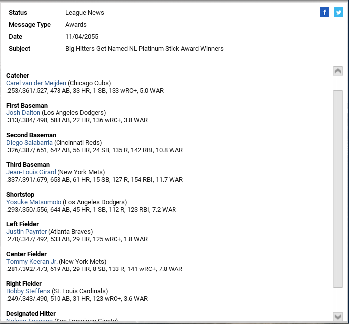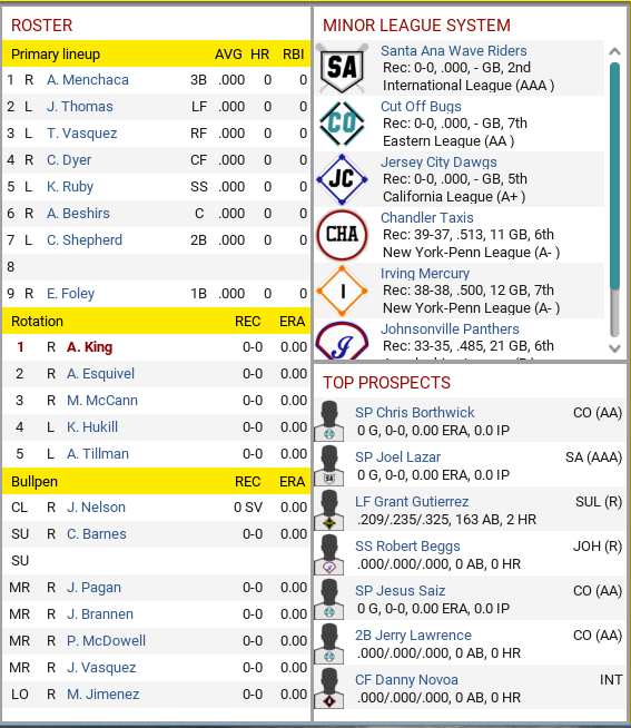 King was hired by Miami to lead the team with a 2yr deal at 398k per. Powers finally gets another coaching gig after sitting out the past 4 years and will lead Houston with a 3yr 735k per deal. Last but not least, Nuka is moved up from the hitting coach in AA to bench coach in Chicago for the palehose. He has 1yr left at 144k per. Keeran is still with the UVV and has 1yr left with a Good reputation. Snyder is bouncing around the PECOS with a Fair reputation. Marks and Long are still with Austin and Tampa respectively. |
