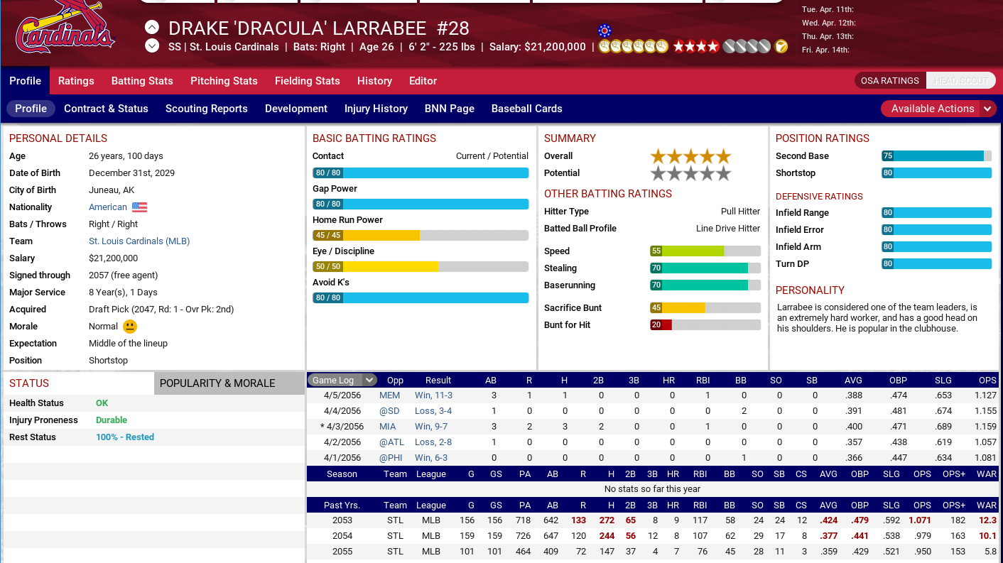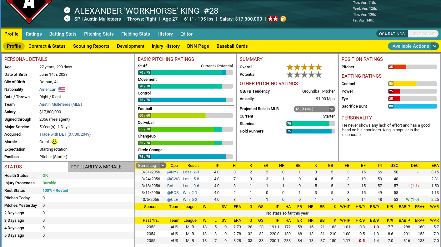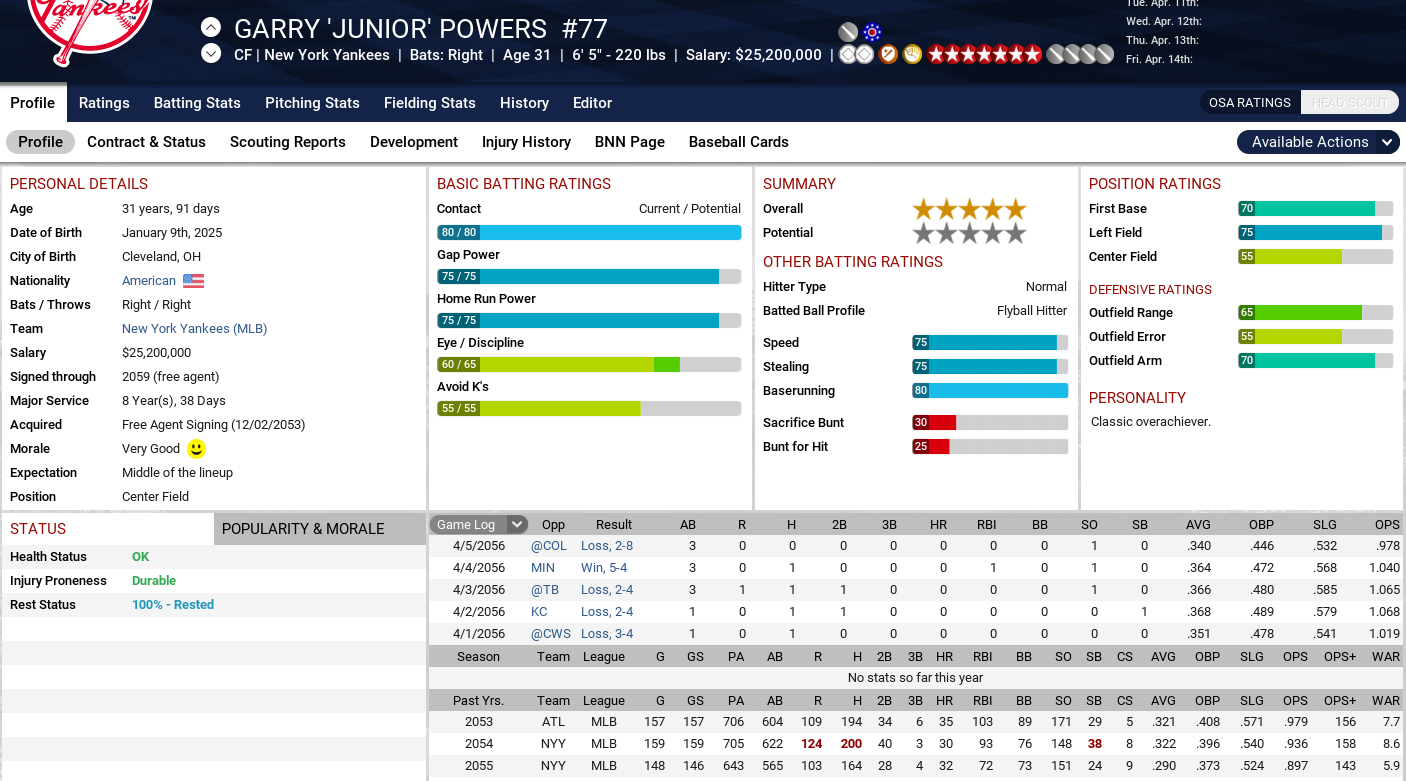 King was hired by Miami to lead the team with a 2yr deal at 398k per. Powers finally gets another coaching gig after sitting out the past 4 years and will lead Houston with a 3yr 735k per deal. Last but not least, Nuka is moved up from the hitting coach in AA to bench coach in Chicago for the palehose. He has 1yr left at 144k per. Keeran is still with the UVV and has 1yr left with a Good reputation. Snyder is bouncing around the PECOS with a Fair reputation. Marks and Long are still with Austin and Tampa respectively. |