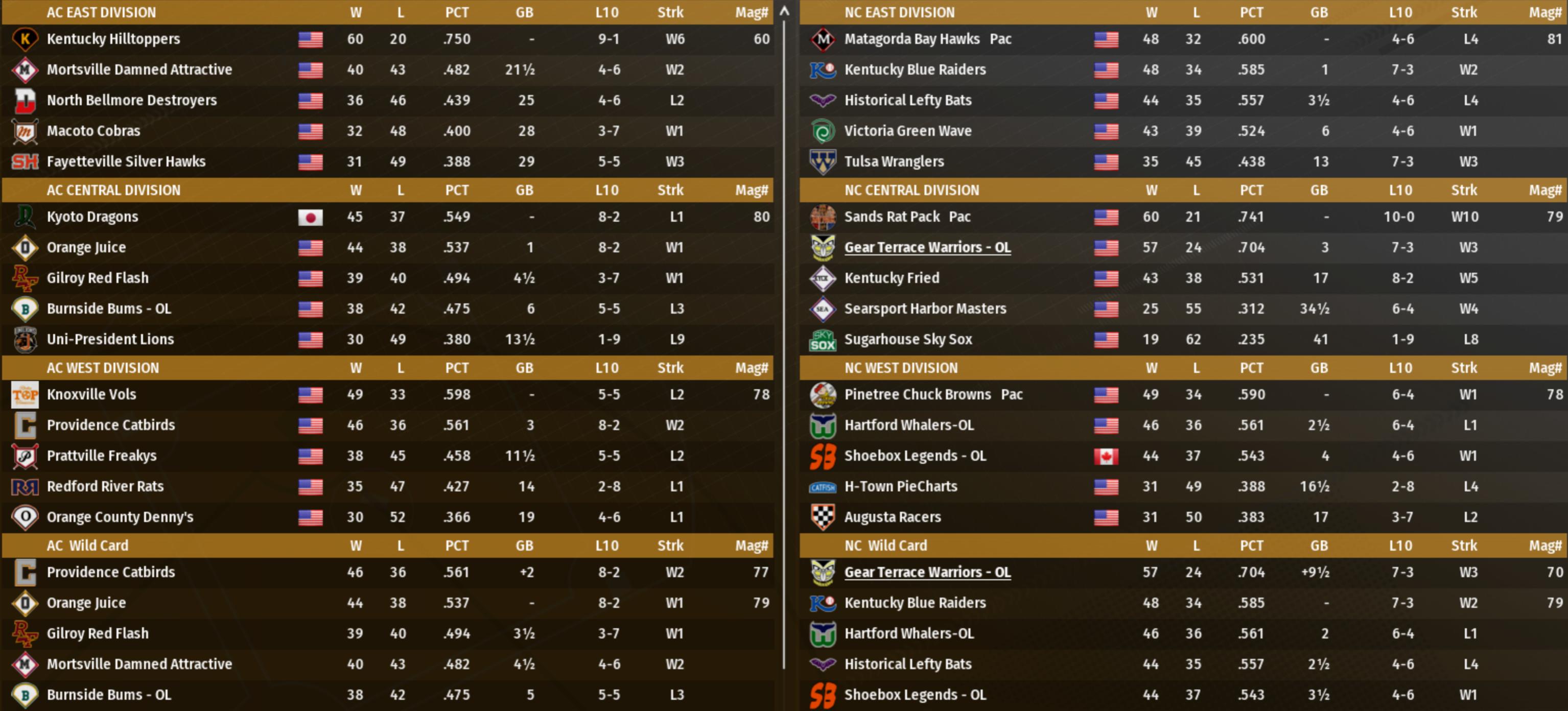 In the American Conference, no OL team leads a division. Patriots, at 4 games out, are the closest. They also currently stand in a Wild Card spot, with the Commodores and LabRats close enough to hope a strong second half will raise them up the standings. In the National, Keystone holds solid, if not unsurmountable, division lead, while Otsego is looking at having to climb over several teams to get into the wild card hunt.