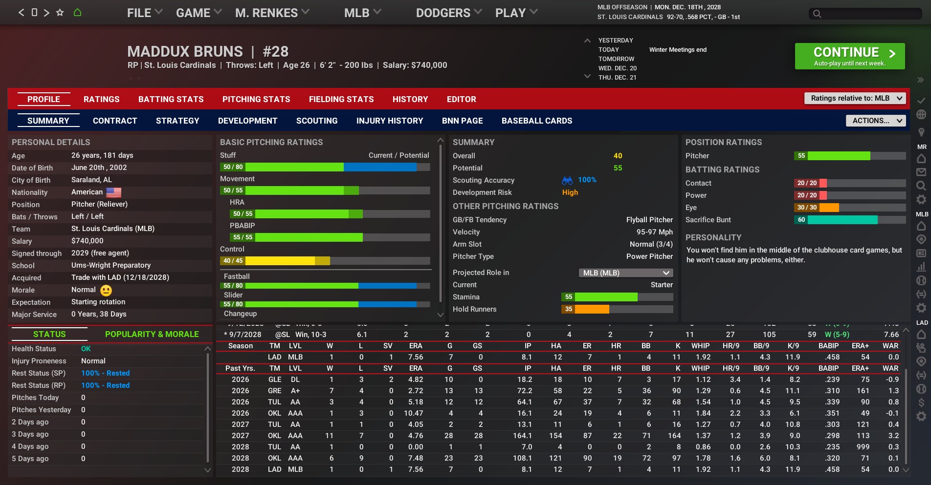 The 26-year-old Winn had an impressive run in St. Louis. He broke into the majors late in the 2023 season and claimed the starting shortstop position in 2024's spring training. He's held it ever since, but a drop in performance at the place raised questions along with an occasional inconsistency defensively. And when Abrams became available. The Cardinals jumped at it. In 2028, Winn started 143 games/142 starts and hit .230 with seven home runs and 43 RBIs. Although, he did have a career high 41 steals. For his career, Winn was a .241 hitter with 48 home runs and 264 RBIs in 729 games/708 starts. A first-round pick in the 2021 draft by the Dodgers, Bruns finally made his major-league debut last season. In seven games, all in relief, he was 1-0 with one save and a 7.56 ERA. |