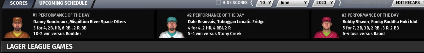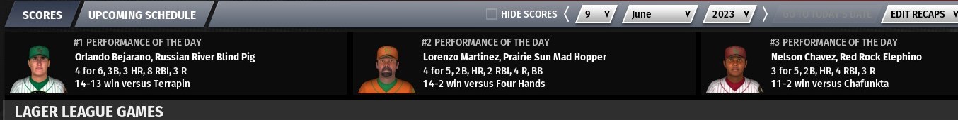 Gold beer award: Chris Rogers of Twisted X Chupahopra - Rogers went 2-for-4 with 2 home runs, 7 RBIs and 2 runs scored in an 8-4 win over Daft Badger Hoppypotamus Silver beer award: Dave Perot of Tattered Flag Man of War - Perot went 3-for-5 with a triple, a home run, 6 RBIs and 2 runs scored in a 9-8 win over Prairie Sun Mad Hopper Bronze beer award: Luis Rodriguez of Firefly Hollow Dire Chinchilla - Rodriguez went 7 innings, giving up 4 hits and no runs with 2 walks and 11 strikeouts in a 1-0 win over Scorched Earth Giant Killer other scores from around the league: -Big Sky Trout Slayer defeat Meadowlark Mob Barley 6-3 -Chafunkta Kingfish defeat Crooked Crab Furious George 13-6 in 11 innings -Rabid Dwarves of Doom defeat Stony Creek Crankenstein 10-1 |
