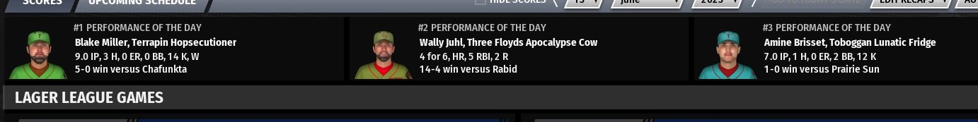 Gold beer award: Blake Miller of Terrapin Hopsecutioner - Miller went 9 innings, giving up 3 hits and no runs with 0 walks an 14 strikeouts in a 5-0 win over Chafunkta Kingfish Silver beer award: Wally Juhl of Three Floyds Apocalypse Cow - Juhl went 4-for-6 with a home run, 5 RBIs and 2 runs scored in a 14-4 win over Rabid Dwarves of Doom Bronze beer award: Amine Brisset of Toboggan Lunatic Fridge - Brisset went 7 innings, giving up 1 hit and no runs with 2 walks and 12 strikeouts in a 1-0 win over Prairie Sun Mad Hopper other scores from around the league: -Horsefly Jazzy Razzy defeat Big Sky Trout Slayer 4-3 in 11 innings -Laughing Sun Red Dwarf defeat Firefly Hollow DIre Chinchilla 6-5 -Twisted X Chupahopra defeat Foulmouthed Malcontent 7-5 -Great Raft Reasonably Corrupt defeat Ballast Point Commodores 6-3 -Charleville Half Wits defeat Weyerbacher Blithering Idiot 10-0 -Four Hands Typhon defeat Crooked Crab Furious George 4-3 -Smog City Sabre Toothed Squirrels defeat Thimble Island Kraken 6-2 -Funky Buddha Huki Idol defeat Jester King Das Wunderkind 4-3 -Red Rock Elephino defeat Tattered Flag Man of War 8-5 -Odious Cellars Rubied Perspective defeat Russian River Blind Pig 1-0 -Stony Creek Crankenstein defeat Kona Pipeline 3-1 -Palmetto Ghost Rider defeat Sleeping Giant Beaver Duck 8-2 -Boulder Killer Penguin defeat Texas Leaguer Chin Music 3-2 -Sierra Nevada Narwhals defeat Meadowlark Mob Barley 9-1 -Waikiki Ala Moana defeat Daft Badger Hoppypotamus 8-6 -Goose Island Goslings defeat Tree House Tornado 4-2 -Mispillion River Space Otters defeat Scorched Earth Giant Killer 7-4 |
