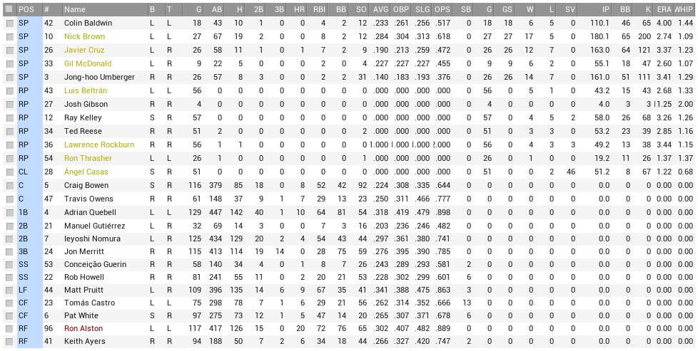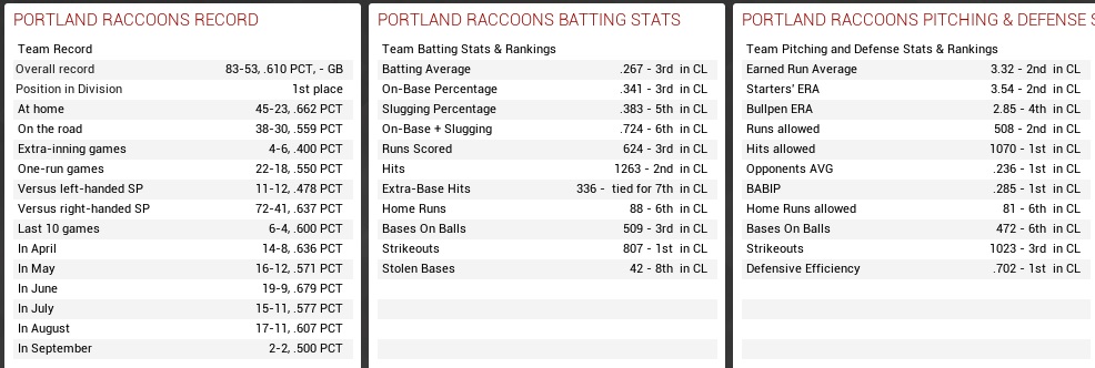 Well, they were horrendous. -113 run differential with the worst offense in the Continental League, and the fourth-worst pitching certainly didn’t help their cause. The Raccoons were playing .667 against the Loggers this year, having won 8 of 12 games from them. Projected matchups: Gil McDonald (5-1, 2.53 ERA) vs. A.J. Bartels (7-7, 4.52 ERA) Colin Baldwin (6-5, 3.88 ERA) vs. Roy Thomas (12-9, 3.62 ERA) Jong-hoo Umberger (13-7, 3.40 ERA) vs. Gabriel Caro (9-13, 3.14 ERA) And the right-handed parade continues – no exceptions in this series. Too bad Ron Alston is down for this week. Game 1 MIL: CF J.R. Richardson – 2B Luján – C Baca – 3B Townsley – SS Mateo – LF Davenport – 1B T. Austin – RF Dally – P Bartels POR: CF Castro – 3B Merritt – 1B Quebell – LF Pruitt – C Bowen – RF Ayers – 2B Nomura – SS Guerin – P McDonald Gil McDonald struck out five on his first time through the Loggers’ lineup, with the Loggers not logging a hit until the fifth inning, a Tim Austin double to left. Too bad that there was a runner on first, Jaime Mateo, who reached third base on the knock, and there was only one out. But McDonald struck out Justin Dally and looked like he’d get out of the inning, at least until A.J. Bartels knocked a single past Merritt and plated both runners. Also, in more bad news, the Raccoons had stranded pairs in the first and second innings and since then had been silent and trailed 2-0. Things didn’t get better, with McDonald reaching on an error and Castro drawing a walk in the bottom 5th, only to be left on as well. McDonald then fell apart in the sixth, walked two and was knocked out by a Willie Davenport double that put the Loggers on top 4-0. Overall, he struck out eight and walked five. The bullpen turned an already highly dismal game into a Monday night rout in the seventh, with Josh Gibson putting on two runners. Beltran replaced him and only faced Baca, who singled, and when Ray Kelley came in with the bases loaded he served up a 3-run triple to Bob Townsley to put the Raccoons in the box. Not that the – remember: miserable – Loggers were done. Ted Reese appeared in the eighth, allowed a single to Tim Austin, a double to Justin Dally, and then walked Leborio Catalo to load the bases with no outs. Ron Thrasher gave up a 2-run double to J.R. Richardson to keep the scoreboard alit. Bartels allowed two hits and whiffed four in seven shutout innings. 9-0 Loggers. Yikes. Okay, this was a complete stinker of a game and perfect to ruin the good mood and semi-confidence we had after winning the weekend set with the New Yorkians. Three hits, lots of misery. Nobody did anything remotely useful. It can hardly get worse in the rest of the set. Game 2 MIL: LF Davenport – 2B Luján – 1B Catalo – CF T. Austin – 3B Townsley – C Rosa – SS Mateo – RF J.R. Richardson – P R. Thomas POR: CF Castro – 3B Merritt – 1B Quebell – LF Pruitt – C Bowen – RF Ayers – 2B Nomura – SS Howell – P Baldwin The ball was certainly flying well off the bat when Colin Baldwin was batting, and the Loggers made hard contact five times in the first inning, landing three hits and scored two runs, both on sac flies. While Quebell made up that early deficit with a 2-run home run in the bottom of the first – which gave the Coons the total of one hitter that had double-digit dingers and wasn’t aching – Baldwin just kept bleeding and ended up allowing nine hits, mostly hard, and four runs in six despicable innings of work. Craig Bowen singled home Quebell in the fifth to at least keep the team only one run out, and Roy Thomas was still pitching in the seventh to allow a leadoff double to the otherwise dead Tomas Castro. Merritt flew out to deep center, moving Castro to third, from where he scored when Quebell’s soft fly to shallow center was juggled and dropped by Tim Austin, which tied the contest at four. Pruitt’s single knocked out Thomas and brought ex-Coon Scott Boone into the game against an unretired Craig Bowen with two on and one out, resulting in an obvious double play grounder. Reese gave up a leadoff single to Townsley in the eighth before starting a double play on Freddy Rosa’s grounder, and Luis Beltran actually managed to retire a left-hander when he retired the pinch-hitting primary catcher Alonso Baca. Two out in the eighth, Howell walked and Pat White singled, but Castro flew out to Richardson, who then started the top 9th with a single off Thrasher. Angel Casas came into the game with the go-ahead run already on base. The Loggers wasted an out with a bunt, and ultimately struck out with Richardson at third, then put Dave Walk into the bottom of the ninth, a right-hander with no special abilities at all, who would face the 2-3-4 guys. 2 and 3 singled, 4 struck out, and 5 drew a walk to load them full with one out. Keith Ayers popped out and was technically out at home, and Nomura flew out to left on a 3-1 pitch, sending the game to extras with three runners stranded. Two scoreless innings from Angel weren’t enough to win anything here, and Ray Kelley started the 11th. He retired the first two batters before the left-handers Richardson and Dally both singled. A full count walk to Willie Davenport loaded the sacks for Antonio Luján, who also ran a full count before striking out. Kelley struck out the side in the 12th before falling to a Suketsune Ito and an RBI triple with nobody out in the 13th. Ito scored easily in the inning, and Wes Gardner, who had already pitched two innings, would start the bottom of the inning with Manuel Gutierrez, the first of three quick groundouts in the inning. 6-4 Loggers. Merritt 2-6, BB; Quebell 2-4, 2 BB, HR, 3 RBI; Bowen 2-4, 2 BB, 2B, RBI; White (PH) 1-1; Casas 2.0 IP, 0 H, 0 R, 0 BB, 2 K; Yeah, well. Well. Well, that’s … oh my. Game 3 MIL: CF J.R. Richardson – SS Luján – 1B Catalo – C Baca – 3B Townsley – 2B G. Torres – LF T. Austin – RF Dally – P Caro POR: 1B Qu