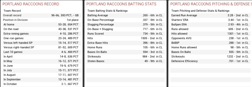 2010 CONTINENTAL LEAGUE CHAMPIONSHIP SERIES Portland Raccoons (96-66) vs. Oklahoma City Thunder (95-67) Tuesday night, Portland, friggin’ cold, nobody cares, because it’s playoff baseball! We haven’t had such fancy bling in 14 years! Yet the Raccoons arrived in this happy place in a rather unhappy state, decimated by injuries and poor form. They had played merely .500 since September 1, almost had blown a sizeable 8-game lead, and had lost two of their important position players, 3B Jon Merritt and OF Tomas Castro, to injuries in the final few weeks. MR Pat Slayton and rookie SP Hector Santos were also tucked away on the DL. Instead of Merritt and Castro, rookie Walt Canning and defensive centerfielder Santiago Trevino were added to the playoff roster. Their opposition, the Thunder, also had injury woes. Half-ace Daniel Dickerson had been on the DL since June, and they were also without their starting centerfielder Jose Gonzalez and backup outfielder David Clarke. Another outfielder, Martin Covington was ailing with an oblique issue. The Raccoons had a few decisions to make. The first concerned their rotation and which starter to drop. Brown – Umberger – Cruz was a rather moot point of discussion, but between Colin Baldwin and Gil McDonald you could argue for against both of them. However, the pendulum swung in favor of Baldwin, and not because he had had such a good season, but rather because the Thunder lineup was even more distorted in favor of left-handed batting than the Coons’ was. Colin Baldwin had started three games against Oklahoma during the season, and had won all three of them. Gil McDonald had faced them once and had been obliterated as recently as September 20. Thus, Gil McDonald moved to the pen, but this might not hold up for the World Series, should the Raccoons make it there. Odds weren’t in their favor. Apart from the slight issue of the missing pieces in the lineup, there was also the problem that they had not played sound baseball for an extended period of time, and had gotten worse in the last three weeks. The rotation was struggling, the bullpen was prone to blowups, and the corner outfielders had essentially died in August. Matt Pruitt and Ron Alston were as cold as could be. The Thunder had the highest OBP in the Continental League, and were suffocating their opposition by numbers, not by power. They had hit fewer home runs than the disappointing Portland Power Prodigies. Despite the injuries, they still fielded a top 5 that were all batting .275 or better, and all had OBP’s of .371 or better, with Tomas Cardenas, Pablo Ledesma, and Tom Reese all hitting double-digit dingers on top of that. But even in the Raccoons’ second-half diminished state, their pitching was still better than the Thunder’s. Antonio Donis had won 21 games and the ERA title, but the best of the rest was William Raven with a 3.80 ERA. The bullpen was porous, especially if called on early. They had only one left-handed reliever in the pen, Steven Anderson, and he had allowed a few runs to the Coons during the year. In principle, they’re beatable. But the recent offensive shenanigans of the Raccoons are a big concern, and the Thunder might hold a slight edge going into the set. 2010 CONTINENTAL LEAGUE CHAMPIONSHIP SERIES Portland Raccoons (96-66) vs. Oklahoma City Thunder (95-67) Game 1 – Nick Brown (20-6, 2.70 ERA) vs. Takeru Sato (12-11, 4.11 ERA) Antonio Donis had pitched on the weekend and was probably going to pitch game 2 of the series opposing Jong-hoo Umberger. Sato and Donis are their two left-handers, so it’s not a big difference for us. He had stunk all the way since August, but it was the playoffs, and there was no way we could leave Ron Alston on the bench. However, I was hoping for a boost from Keith Ayers, who got the centerfield assignment over Pat White. Canning started at third base, something that would probably hold up throughout the playoffs until he would tear out a leg or two. OCT: 1B J. Lugo – LF Britton – RF Tom Reese – 2B M. Garza – C Ledesma – SS Vieitas – 3B Arreola – CF E. Fernandez – P Sato POR: 1B Quebell – 3B Canning – RF Alston – CF Ayers – LF Pruitt – C Bowen – 2B Nomura – SS Howell – P Brown Almost 33 years old, Nick Brown’s first playoff strikeout after 2,072 K in the regular season was Pablo Ledesma at the end of the first inning. Jose Lugo, normally not batting in the top regions of the order, started with a single in a 1-2 count, and Tom Reese walked, but the Thunder popped out twice. While the Coons didn’t exactly made wind early on, much less storm, Brown’s first appearance as wobbly was proven by the third inning and a leadoff walk to the pitcher Sato. While Jose Lugo hit into a double play, Brown then drilled Apasyu Britton and was taken deep by Tom Reese, sending the Thunder up 2-0. Brown led off the bottom of the third and reached base on an infield single. While Quebell flew out to left, Walt Canning squeezed a walk out of Takeru Sato, which put Ron Alston in a prime spot to hit one out for effect, or right into a double play. Of course he chose the latter. While Brownie struck out the side in the fifth inning and reached eight strikeouts for the entire game at that point, the damage had been done, and the Raccoons acted in rather uninspired ways. Craig Bowen hit singles his first two times up, nothing ever came of them. Brown struck out two in the sixth, and struck out Marcos Garza to start the seventh inning. When he struck out Pablo Ledesma, he reached a full dozen on the day, which broke the Continental League playoff record, and he even added one by striking out Herberto Vieitas for 13 total! Yet, all for naught. The Coons went down in order in the fifth, and in the sixth, that one with Ayers grounding out on a 3-0 pitch, and Bowen walked in the seventh, but … just no. No reaction from the lineup whatsoever. Ted Reese replaced Brown in the eighth after Brown had thrown 116 pitche