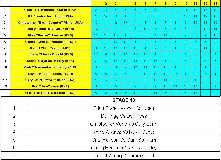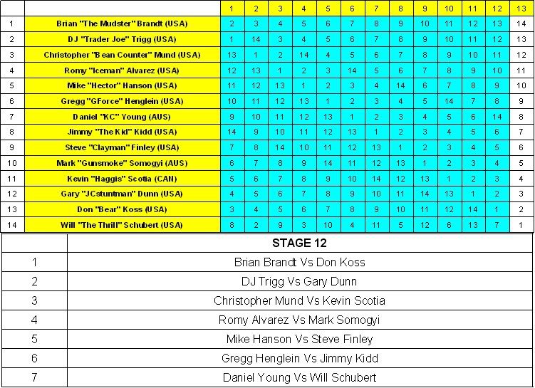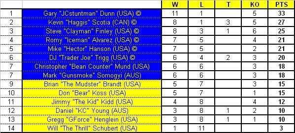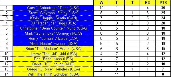 (Just Clic on the link to see the Bout Log) Brian Brandt Vs Don Koss DJ Trigg Vs Gary Dunn Christopher Mund Vs Kevin Scotia Romy Alvarez Vs Mark Somogyi Mike Hanson Vs Steve Finley Gregg Henglein Vs Jimmy Kidd Daniel Young Vs Will Schubert THE CURRENT RANKINGS ![]() © = Qualified to the playoff STAGE 13!!