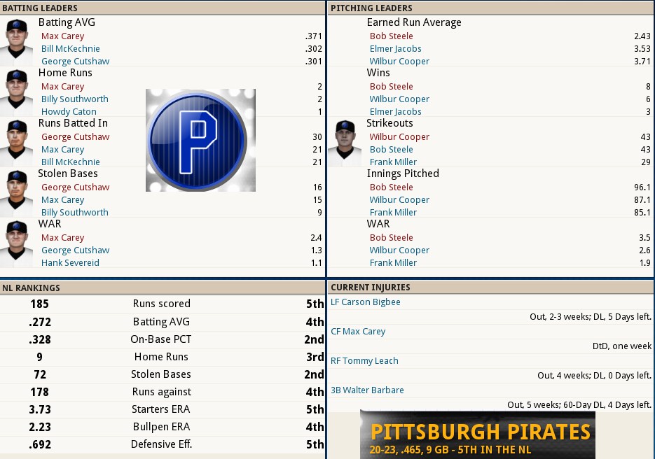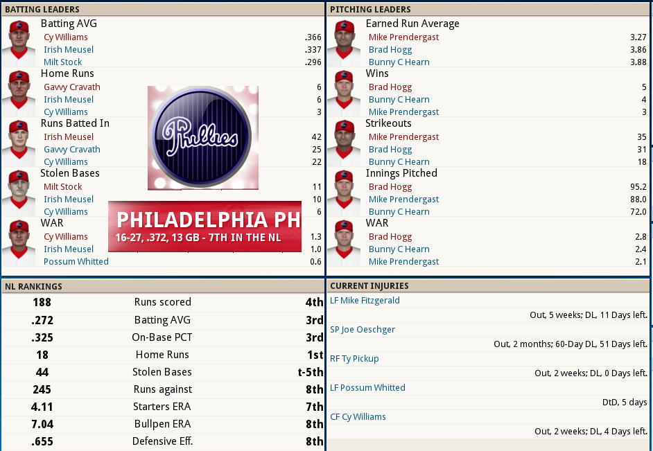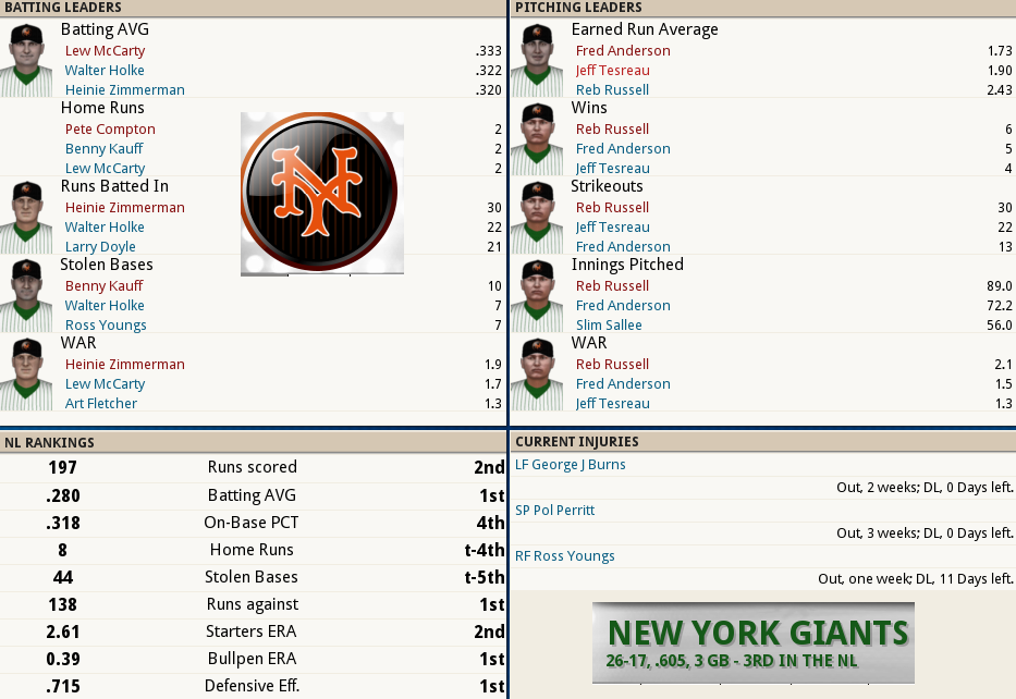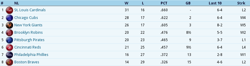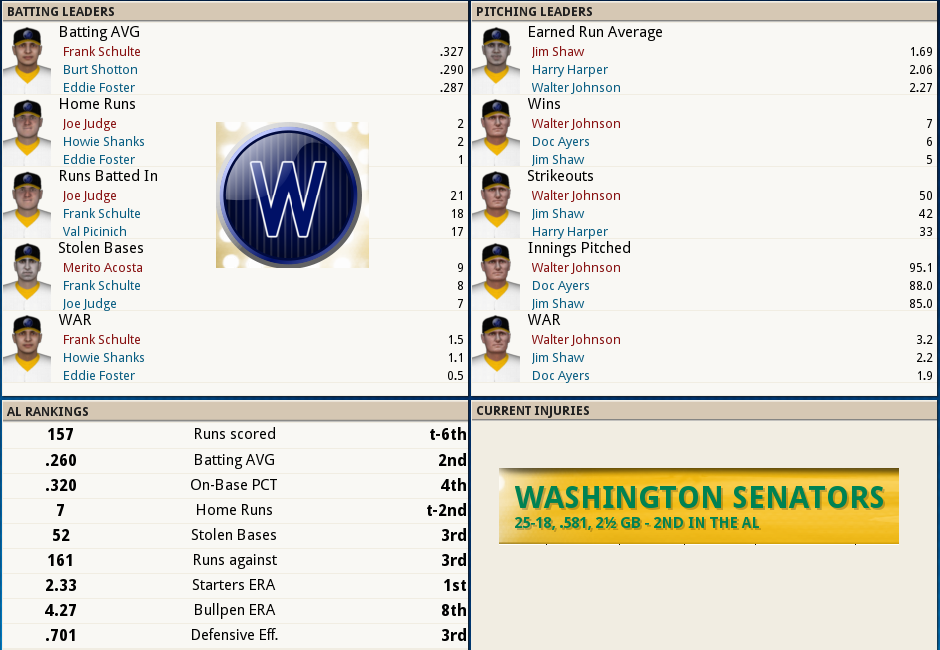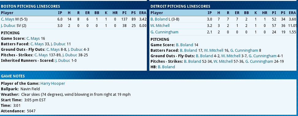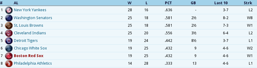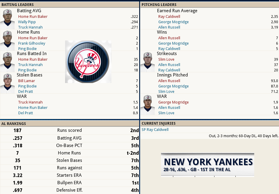 Dubuc Shuts the Door ![]() Boston tried to give one away, but Reliever Jean Dubuc isquickly becoming the Relief corps right hand man for Tight situations. With 7 appearances and only 4 hits and 4 walks in 11.2 IP, was once again meticulous earning his 2ndsave of the year. Babe Ruth connected for his 3rd Homer of the year,a 2 out, 2 run shot to cap the scoring in a 7 run 2nd inning. The Box Score ![]() ![]() The NL Had the day Off ![]() Tillie Walker has Joined the team from the DL!