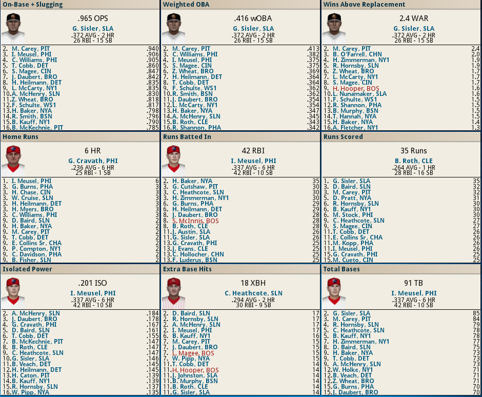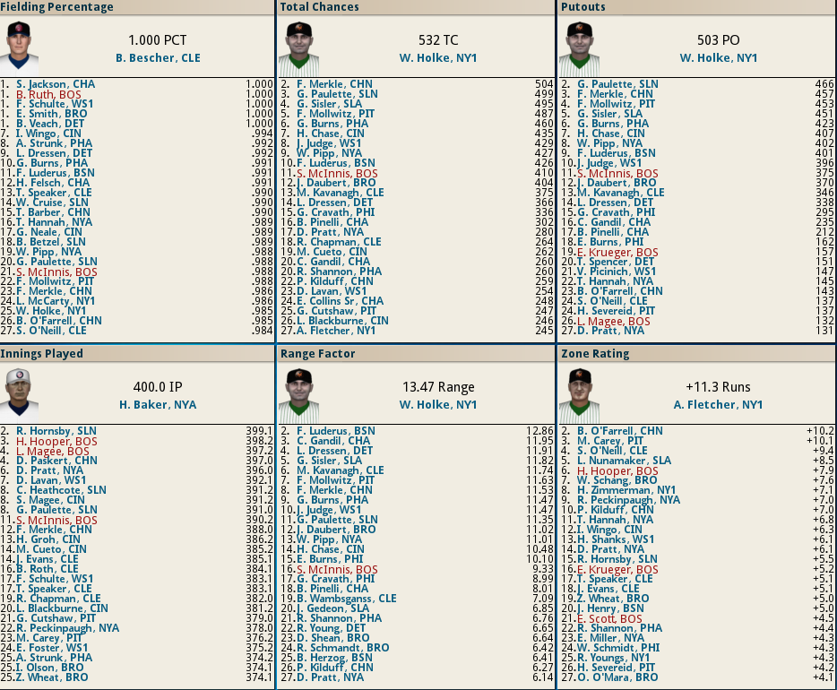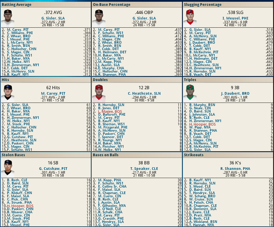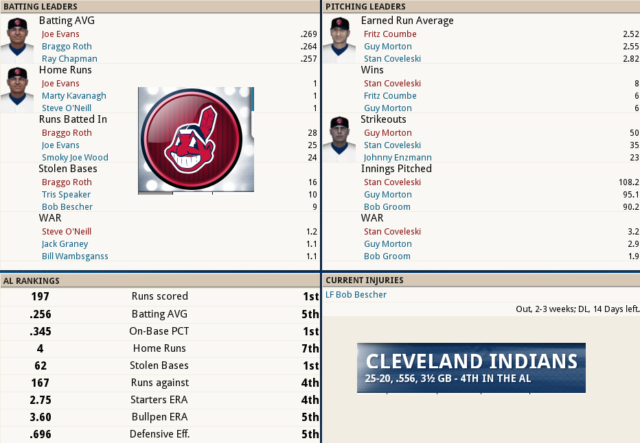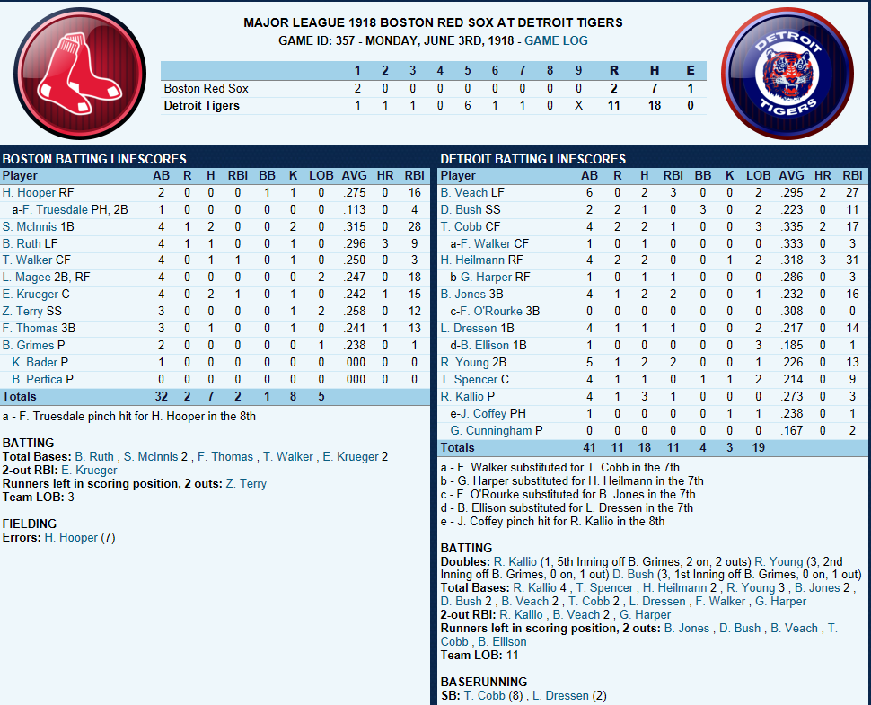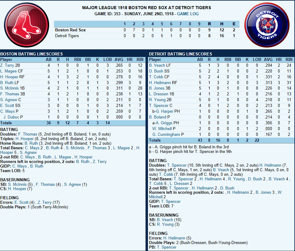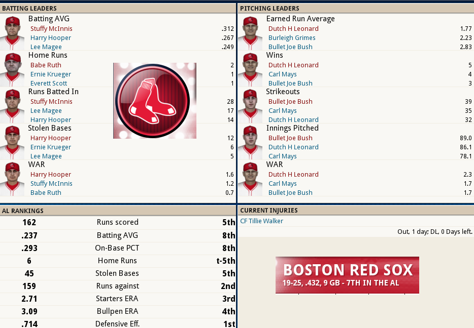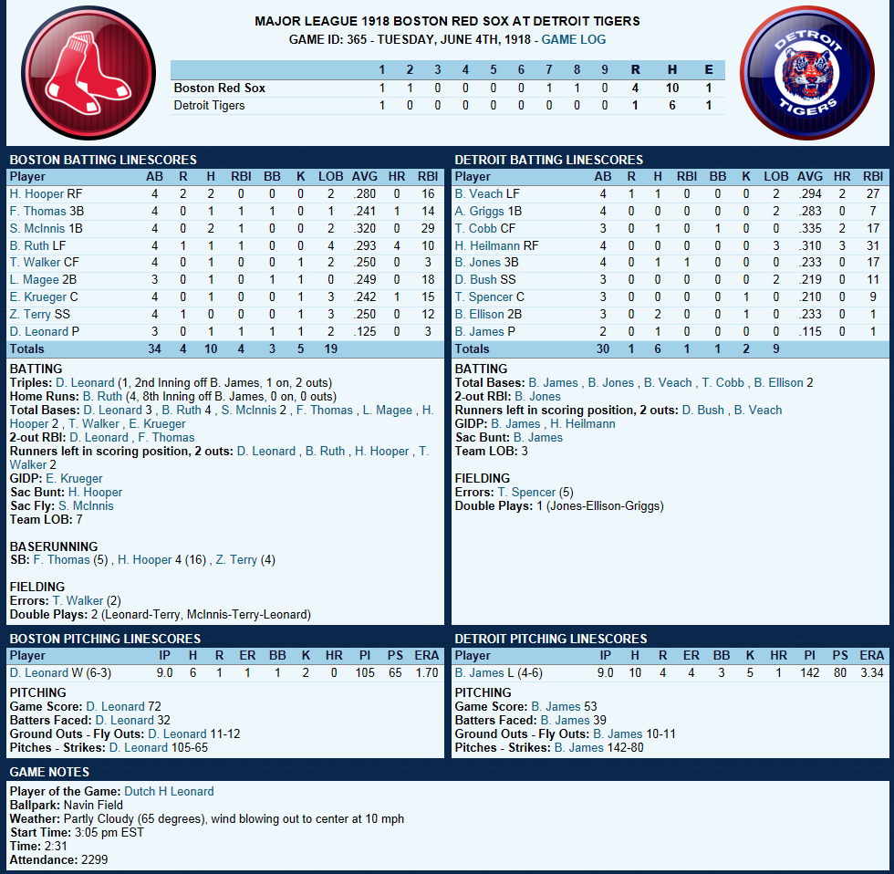 Dutch Leonard masterful in Sox Win! ![]() Dutch Leonard pitched superb allowing only 1 run and 6 hits with a single walk and needing only 105 pitches to complete the outing. Harry Hooper runs wild on the #16th ranked Catcher at throwing out runners. From his new lead-off spot in the batting order Hooper stole 4 bases. Some Guy named Ruth hit his 4th Homer of the year and he’s closing in on the League leader Gavvy Cravath and his 6 Dingers.The new complete Sox Lineup is set in stone barring someone being unable to participate. Ruth is however scheduled to sit out tomorrow’s game @ Cleveland in anticipation of his Starting game 2 of the 5 game series. He will however be available as a Pinch hitter and a late inning defensive replacement. The Box Score ![]() Todays Games ![]() BREAKING NEWS St Louis Managment goes INSANE! ![]() Up Next a 5 game series @ Cleveland and Braggo Roth try's to keep his SB lead over Harry Hooper!
