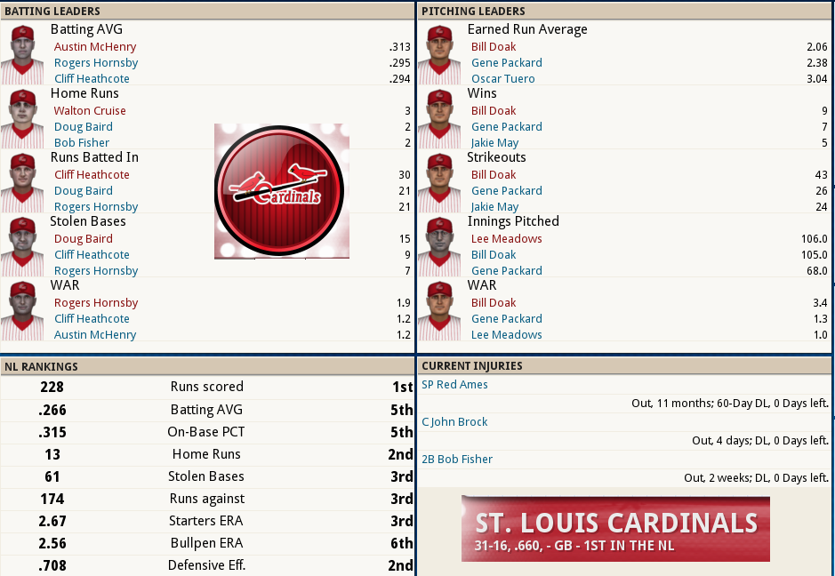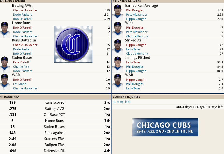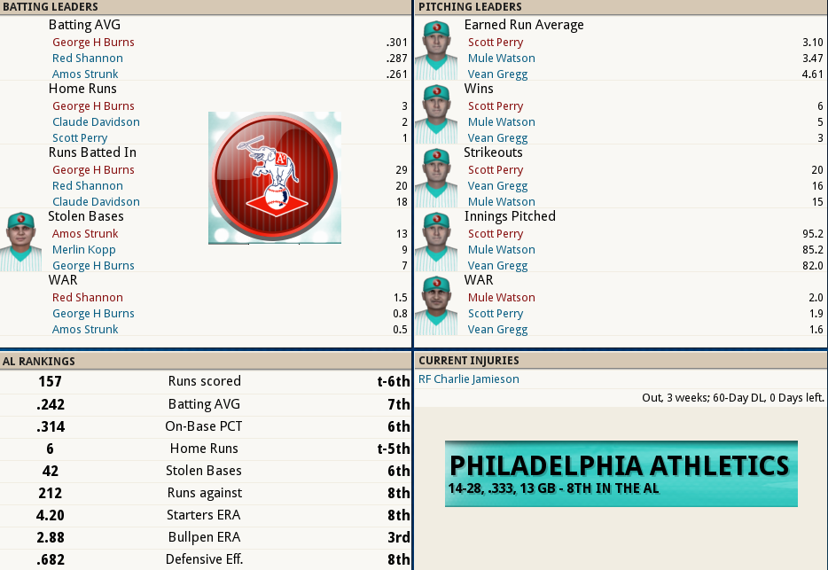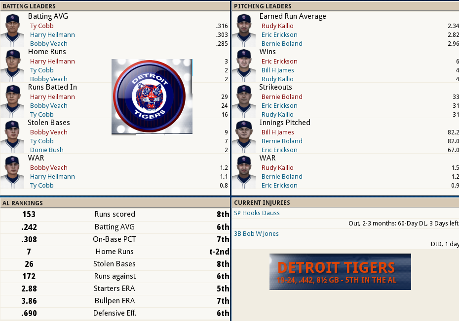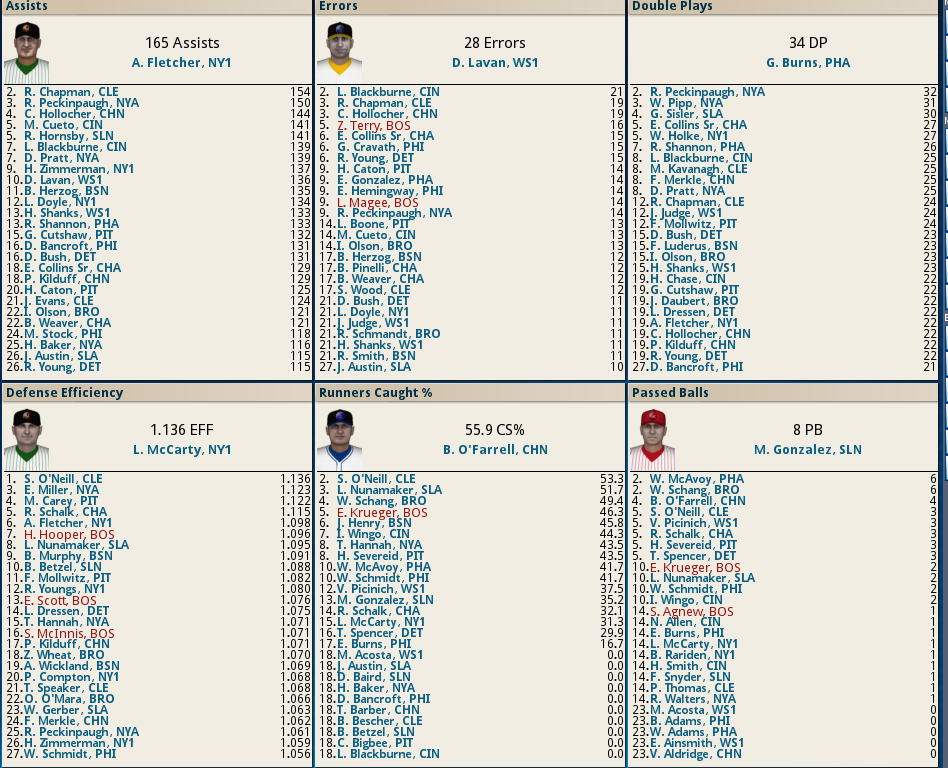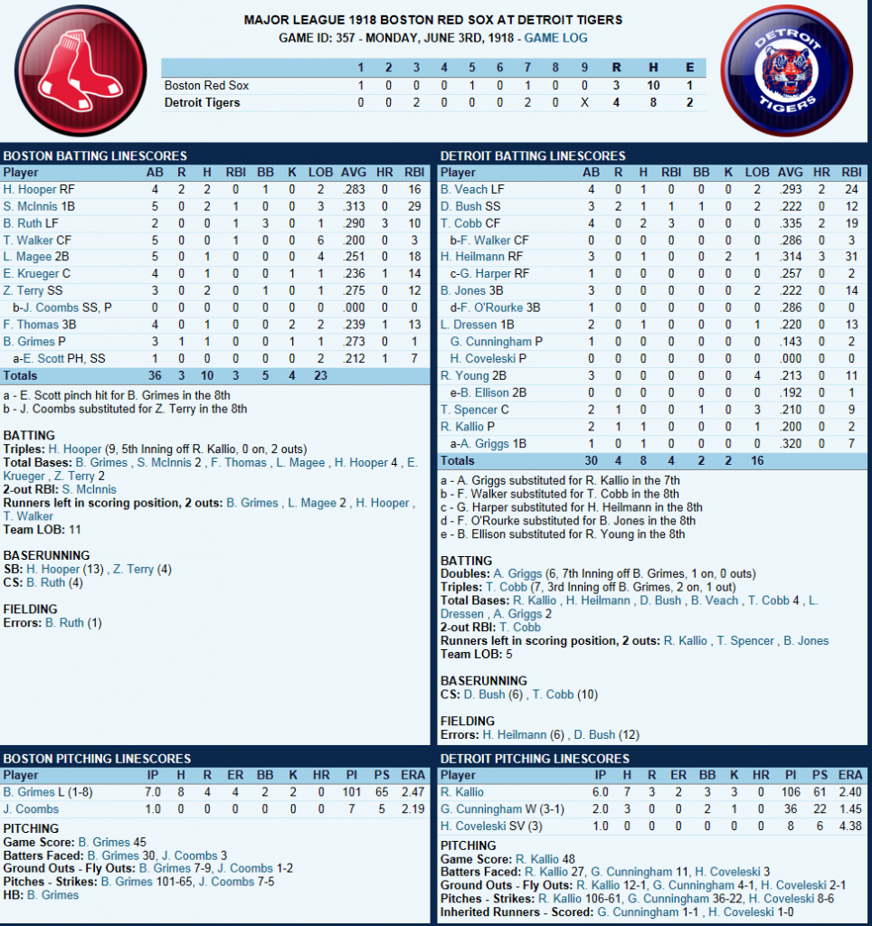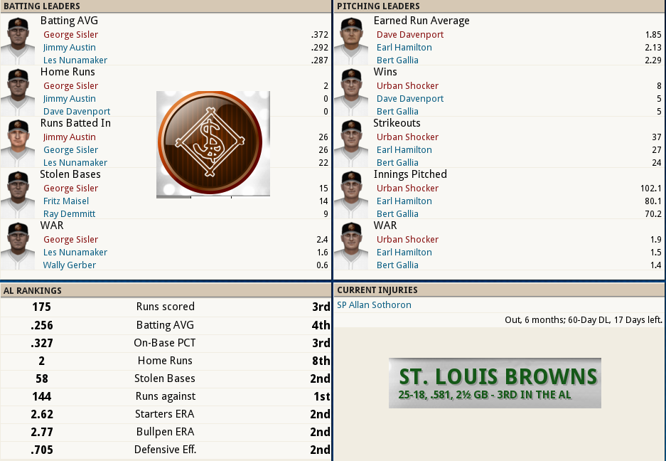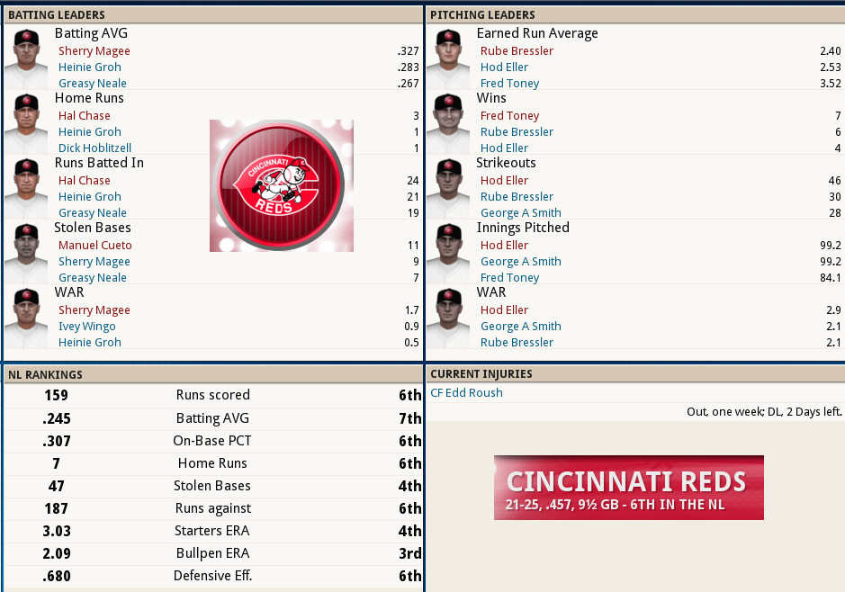 Dutch Leonard masterful in Sox Win! ![]() Dutch Leonard pitched superb allowing only 1 run and 6 hits with a single walk and needing only 105 pitches to complete the outing. Harry Hooper runs wild on the #16th ranked Catcher at throwing out runners. From his new lead-off spot in the batting order Hooper stole 4 bases. Some Guy named Ruth hit his 4th Homer of the year and he’s closing in on the League leader Gavvy Cravath and his 6 Dingers.The new complete Sox Lineup is set in stone barring someone being unable to participate. Ruth is however scheduled to sit out tomorrow’s game @ Cleveland in anticipation of his Starting game 2 of the 5 game series. He will however be available as a Pinch hitter and a late inning defensive replacement. The Box Score ![]() Todays Games ![]() BREAKING NEWS St Louis Managment goes INSANE! ![]() Up Next a 5 game series @ Cleveland and Braggo Roth try's to keep his SB lead over Harry Hooper!