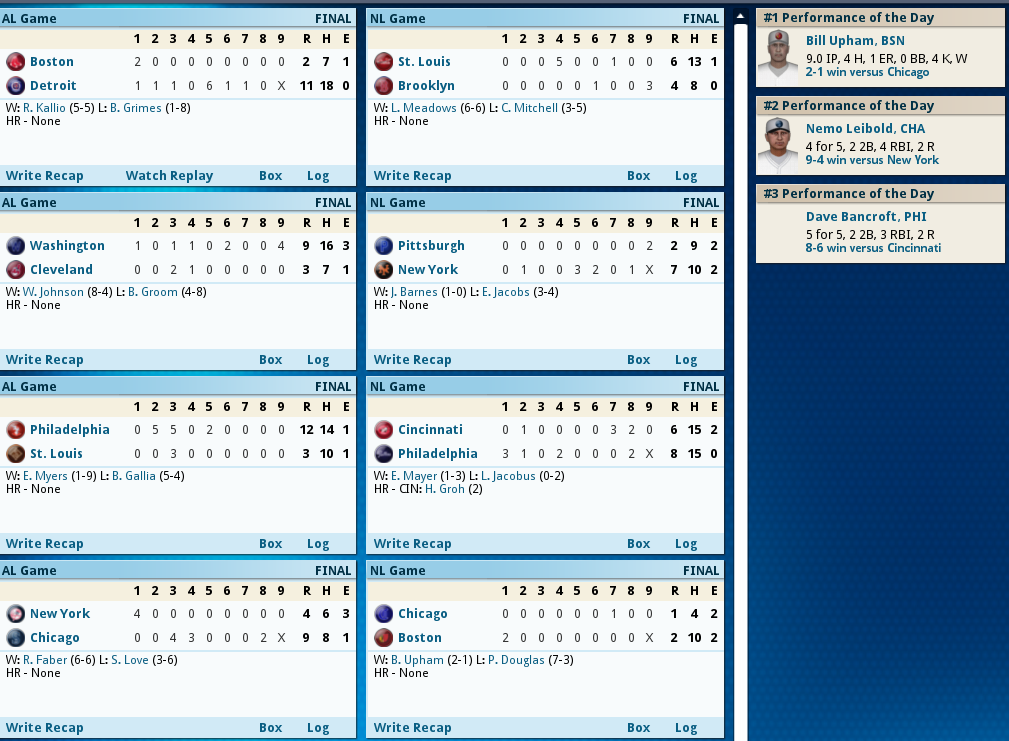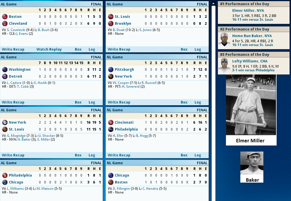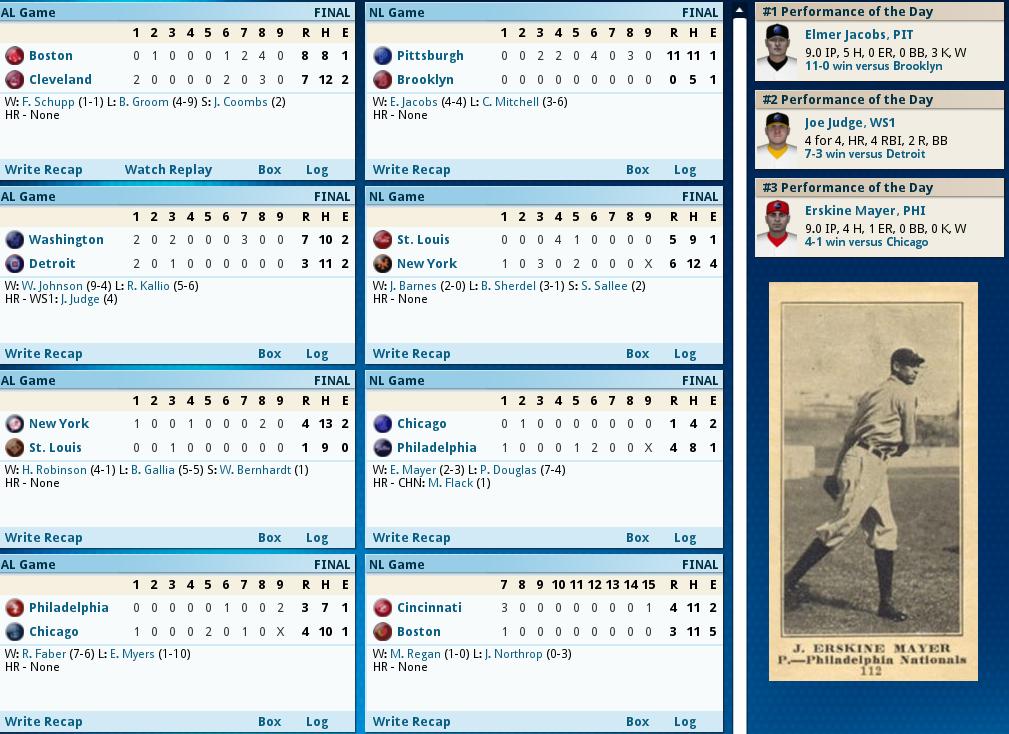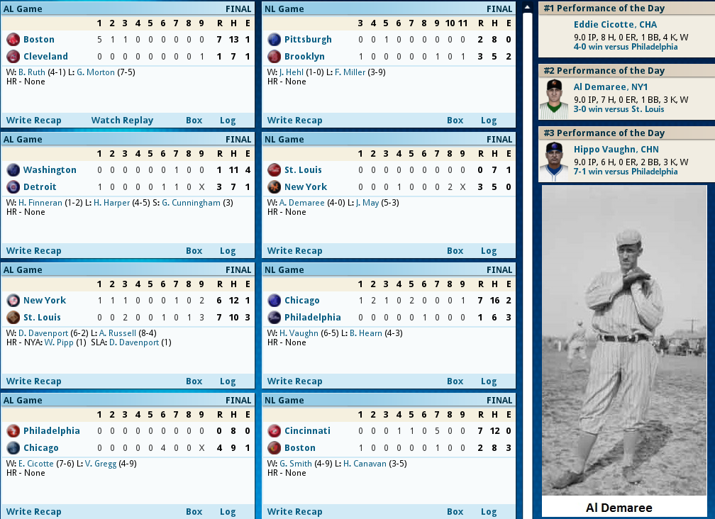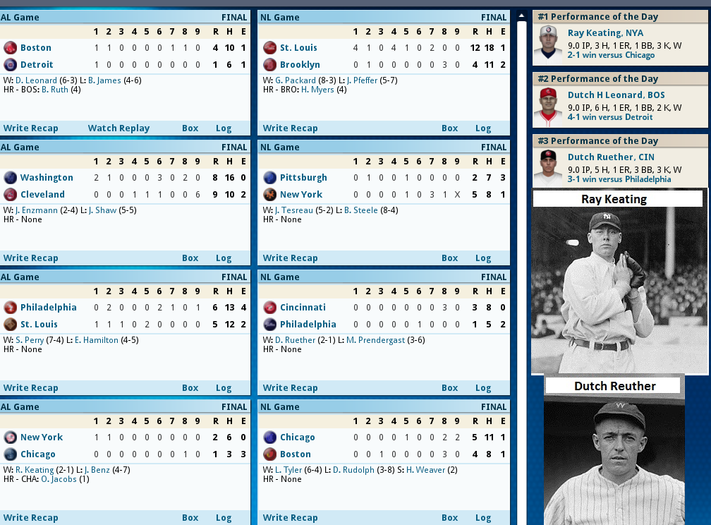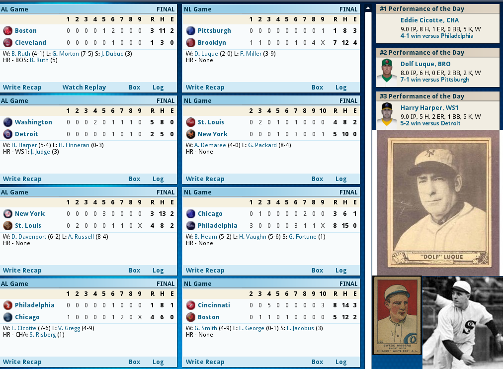 Pinch Hitters get it done! ![]() Hack Miller Delivered the winning blow today 8th inning heroics by two Pinch hitters get the win for Boston. With 2 outs in the bottom of the 8th of a 4-4 game Boston loads the bases with 2 singles and a walk, Fred Thomas then delivers a Ph Single to get a run across and take a 5-4 lead. Management then decides to PH Youthful Hack Miller for Ferdie Schupp and Miller delivers a base clearing triple to take a 8-4 lead and Boston needed every run as Relief Pitcher Jean Dubuc’s scoreless streak ended with a dismal performance allowing 3 runs in 1/3 inning, and JackCoombs had to finish it out getting his 2nd save of the year. The Box Score ![]() ![]() Today's Games ![]() Tomorrow it's Burliegh Grimes against Fritz Coumbe