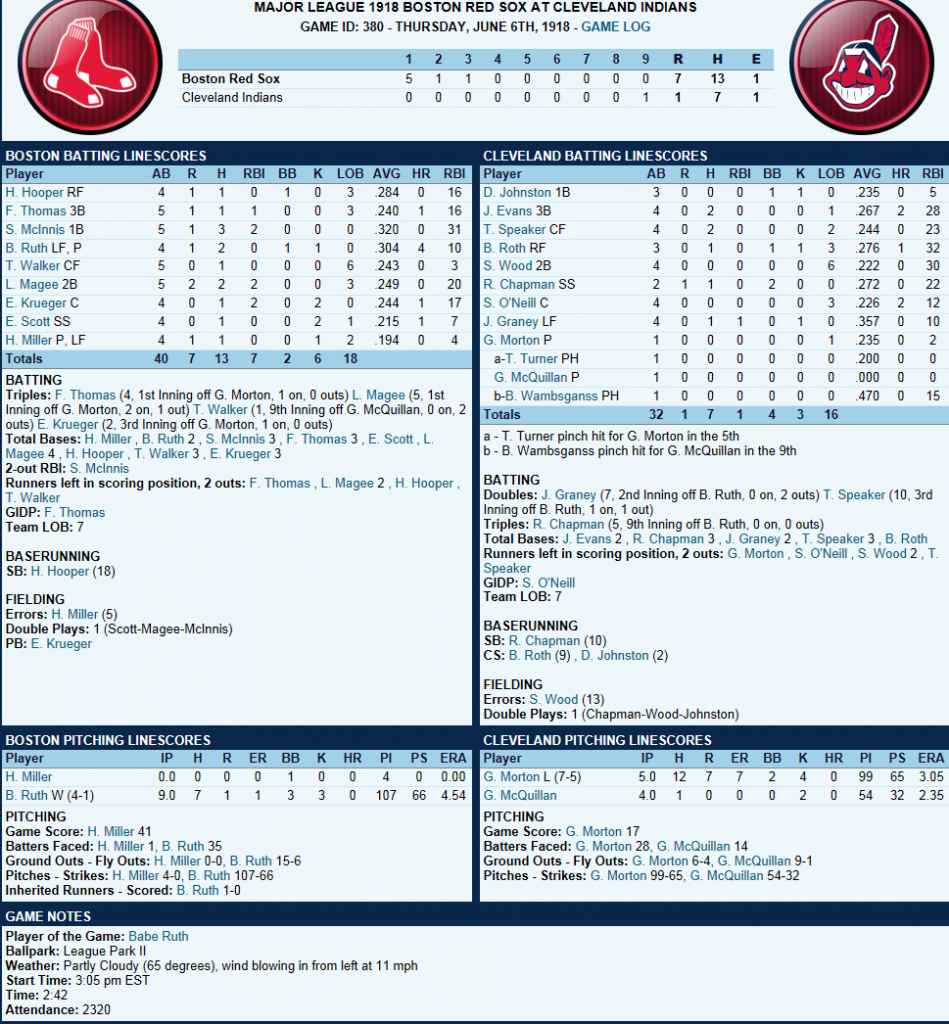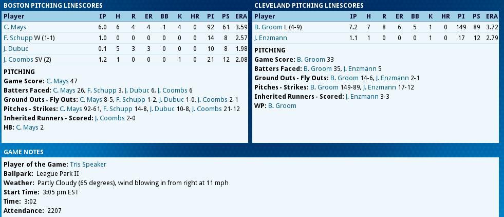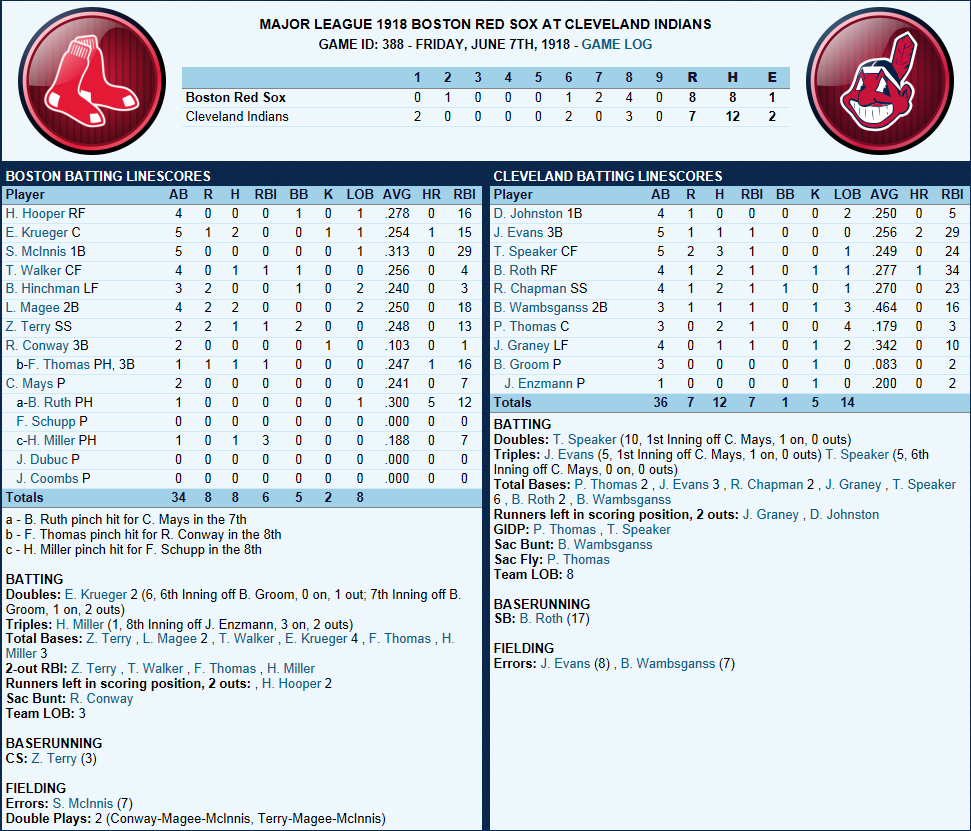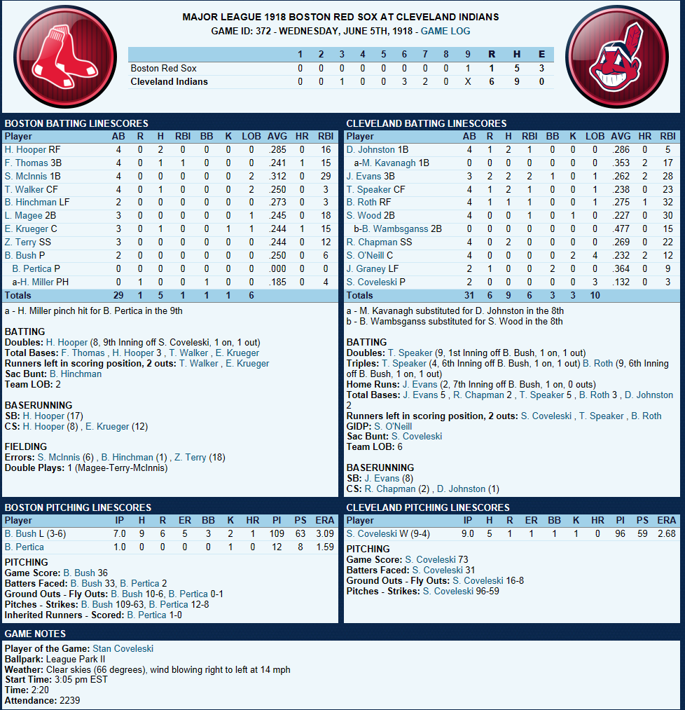 Covoleski notches 9th win Red Sox were never in this one as Cleveland Pitcher Stan Coveleski picks up his 9th win of the season with a 5 hitter. Joe Evans hit his 2nd long ball of the year. Boston’s Hooper steals his 17th base and gets caught for the 8th. The Box Score ffice ffice" />Today's Games ![]() Up Next Ruth on the Mound after a day off n
