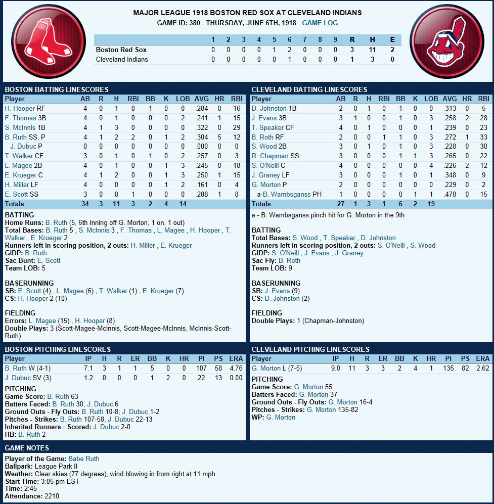 Ruth Gets 4th W, 5th HR ![]() Cleveland's League park Babe Pitched well and hammered a 2-run Homer to a Short RF Porch in Cleveland , League Park; known around the League as a Hitters park for LHB is even shorter than Fenway’s LF wall but has a 45’ Fence that Ruth had no problem clearing with his towering shot. Jean Dubuc continued his relief perfection with 1.2 scoreless innings striking out 2. The Box Score ![]() Todays games ![]() Up Next Carl Mayes vs Bob Groom, Expect a limited role by Ruth as he recooperates from a job well done. n