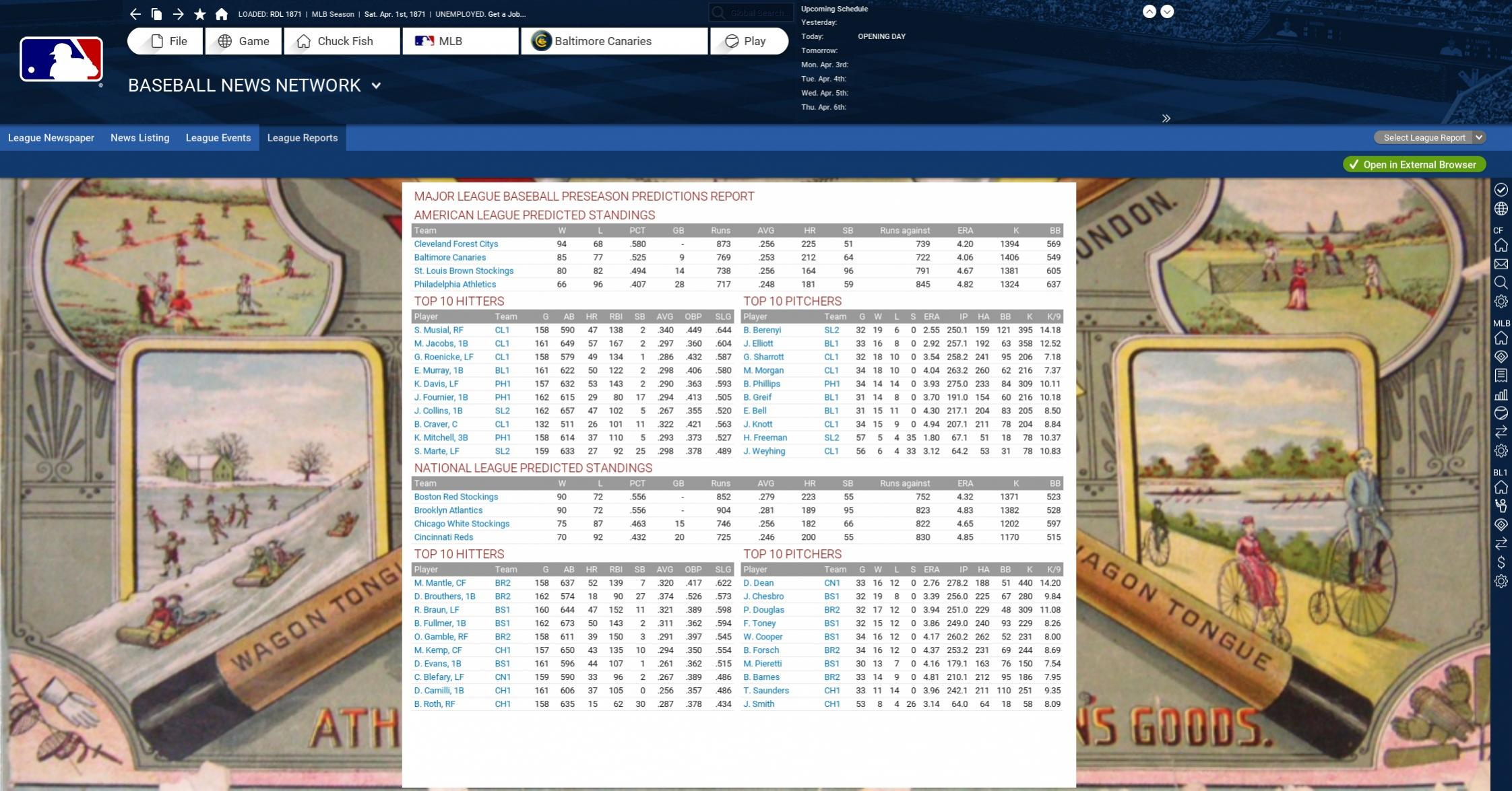 Here's my preseason predictions page for my first try of this league. I have the stats and modifiers all set to 1984 with finances at the current year of 1871. I did have to fix the finances after I punched in 1984 the day before opening day. For some reason the finances reverted to 1984 also. Under league settings I just clicked on fictional contracts for all players and it went back to 1871 contracts. I'll have to keep an eye on that.