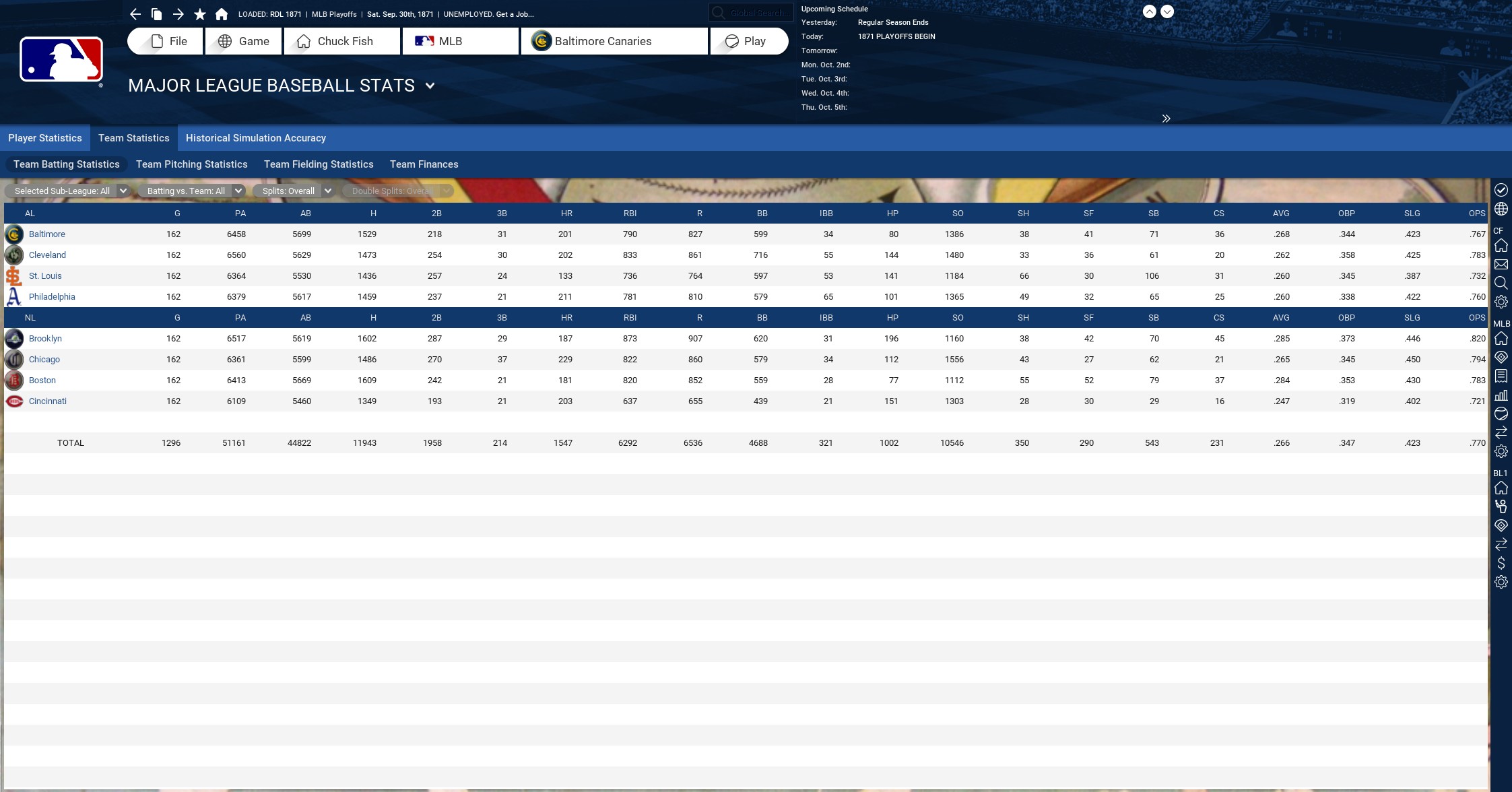 Here are the teams total hitting and pitching stats. Homer totals are definitely up per 1984. 193 homers per team in 1871, 123 per team in 1984 but I have DH on for both leagues. I don't want career DHers like Frank Thomas riding the pine if they end up in the National League w/o DH.