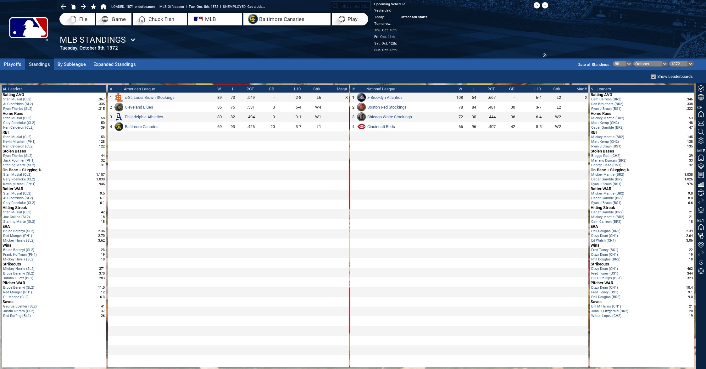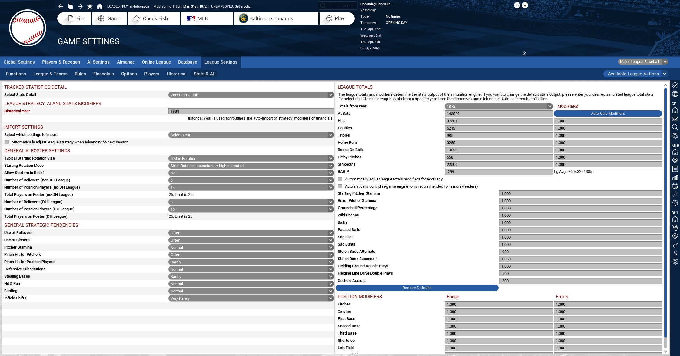 Here is what I had to do at the end of each season using OOTP 18. After clicking on offseason this is what happens: Finances auto resort back to 1984. Just for players though, coaches stay at the 1870's rate. Unless a new coach is hired that year, then he will have a 1984 contract. Messes up the teams budget big time. So you have to go into league settings and under the financial buttons, click on new team budget, player contracts, and coaches contract. This is after you reimport that seasons finances manually. Game schedule reverts to the season your in. So when I checked after the first season the games scheduled went from 162 to 50 because it was 1872. Easy fix, just changed it back to 162. When you get to the preseason date the game advances a year for historical/stats ai sections. It showed 1985 so I changed it back to 1984. I haven't done anything with the ballparks so I don't know what kind of impact on stats this would have. It shouldn't have much IMHO. Here are some screenshots of 1872-1873. I'm thinking that there may be an issue of starting this in 1871. I'm going to put this universe on hold and start one in 1901 to compare. For finances do you think it would be an issue to not touch the finances every season and let the game use the 1984 era every year? http://www.ootpdevelopments.com/boar...1&d=1496975992 http://www.ootpdevelopments.com/boar...1&d=1496975992 http://www.ootpdevelopments.com/boar...1&d=1496975992 |