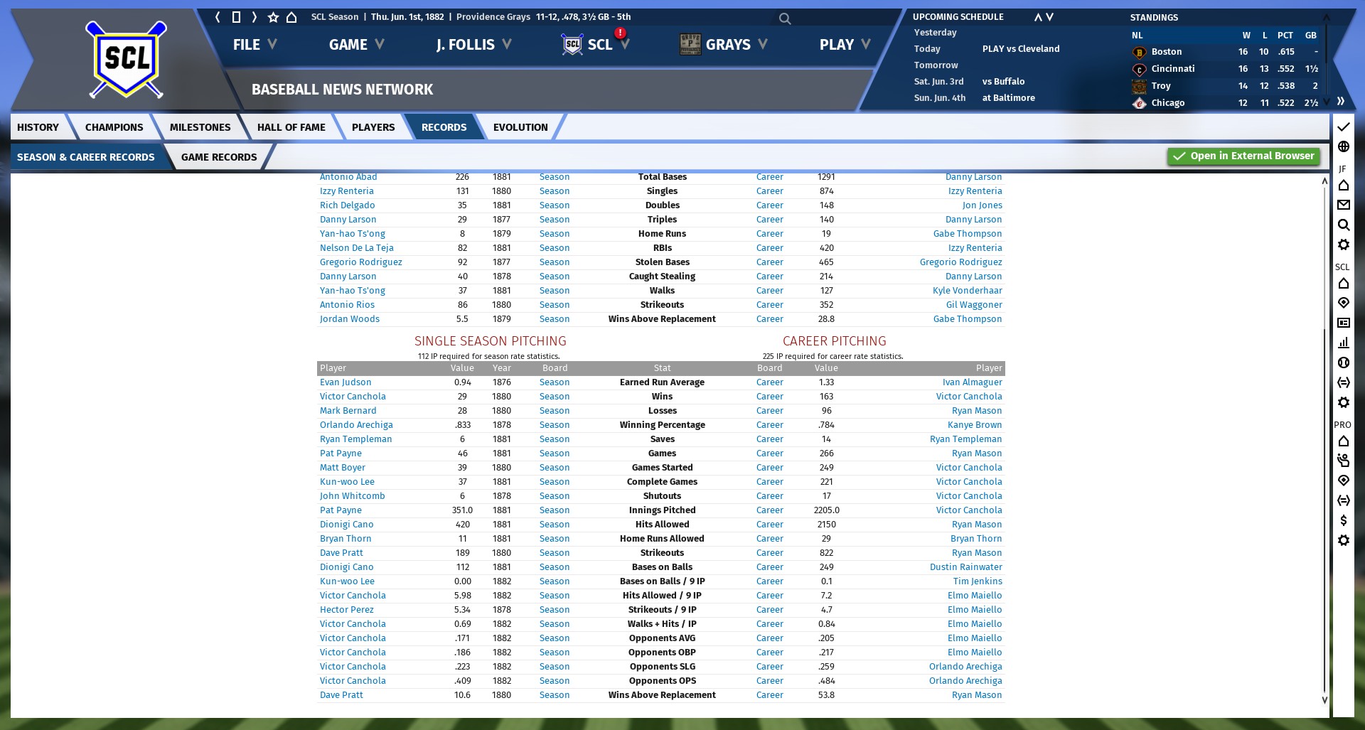 Current NABA and SCL Career leaders as of June 1, 1882