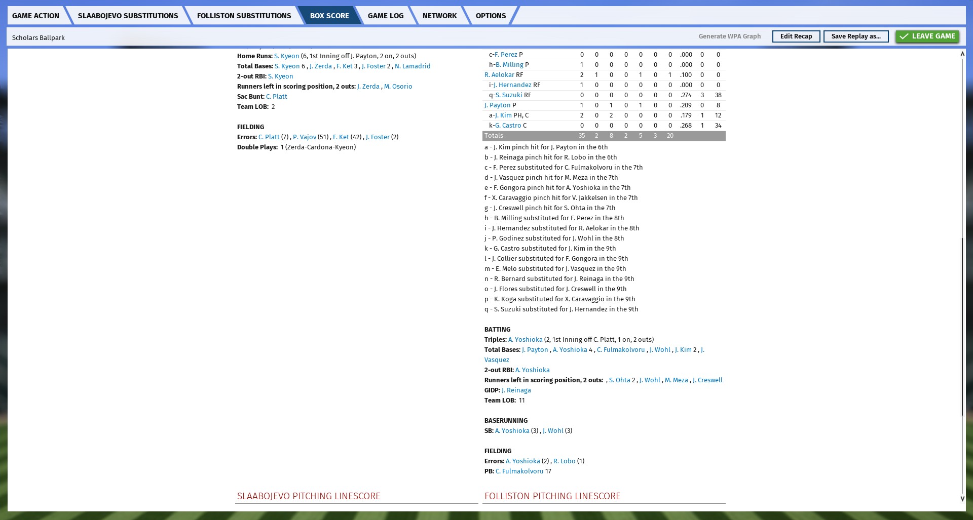 Final 1882 SBC regular-season standings and box score of final Scholars game of the year. seeing as the Scholars couldn't get out of last place, overall, for the entire SBC, I basically decided to let several players play who wouldn't normally play, or who might not normally play certain positions, mainly for experience-gathering purposes. Fulmakolvoru, for instance, I put at catcher, so that other outfielders could get some playing time that they might not otherwise get. He's still young, so maybe there's plenty of room for him to improve in his career, but he didn't play much this year, in any case.