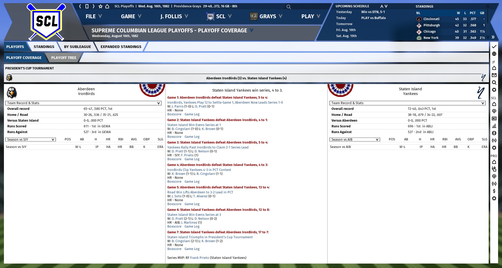 I predict the Archeologists will win in six games here, at most, but I think it more likely that they'll actually win in five, for some reason I may not be able to fully explain here. Tran City could surprise, though, of course. As for the President's Cup Tournament, I predict the Yankees in six, but if Aberdeen pushes it to seven, it could be anyone's series to win or lose. Should be a good series between the two teams here, nevertheless, I think. EDA should have its final 1882 regular-season and/or playoff schedule, et cetera, reposted very soon, most likely. That is all. CD out.