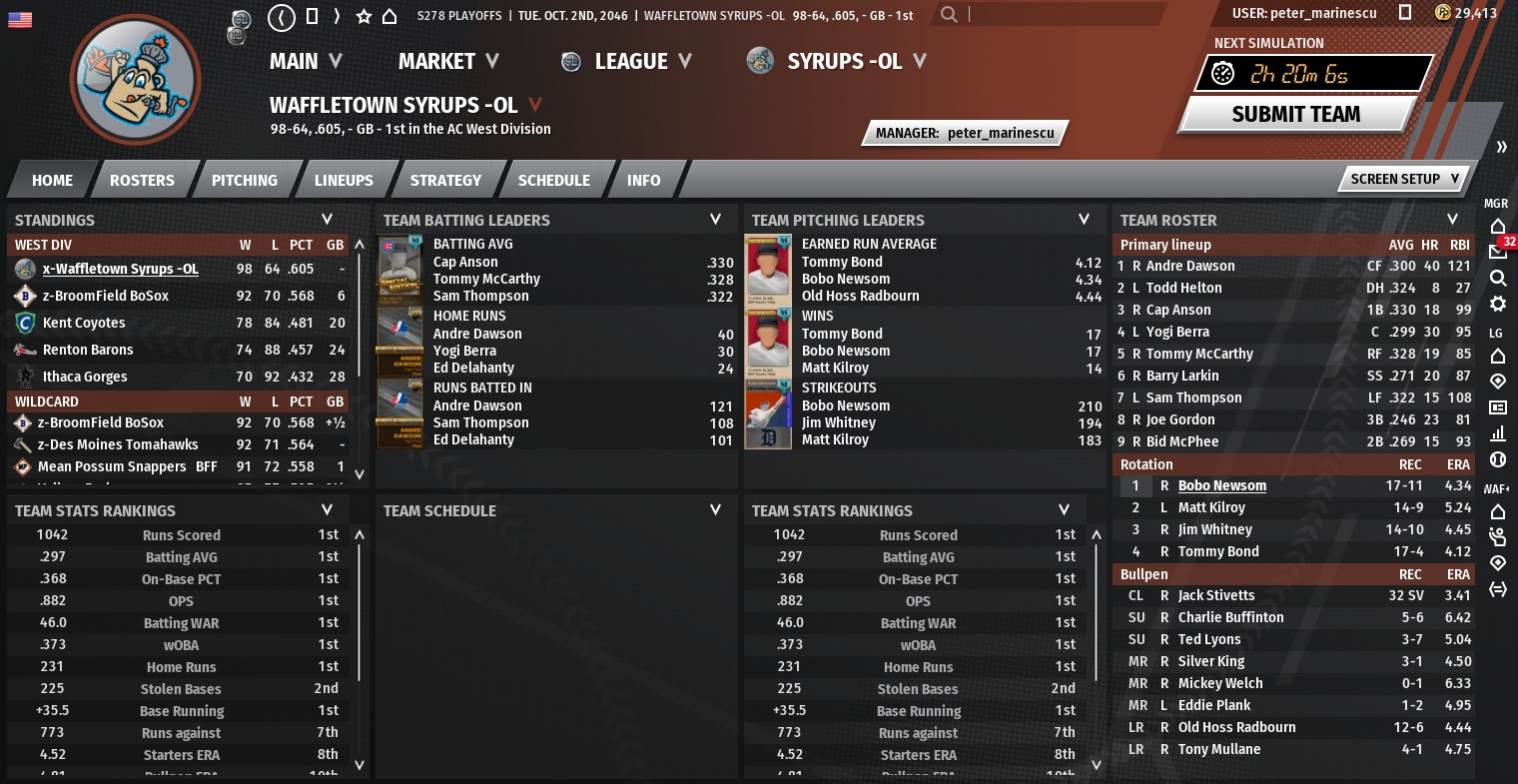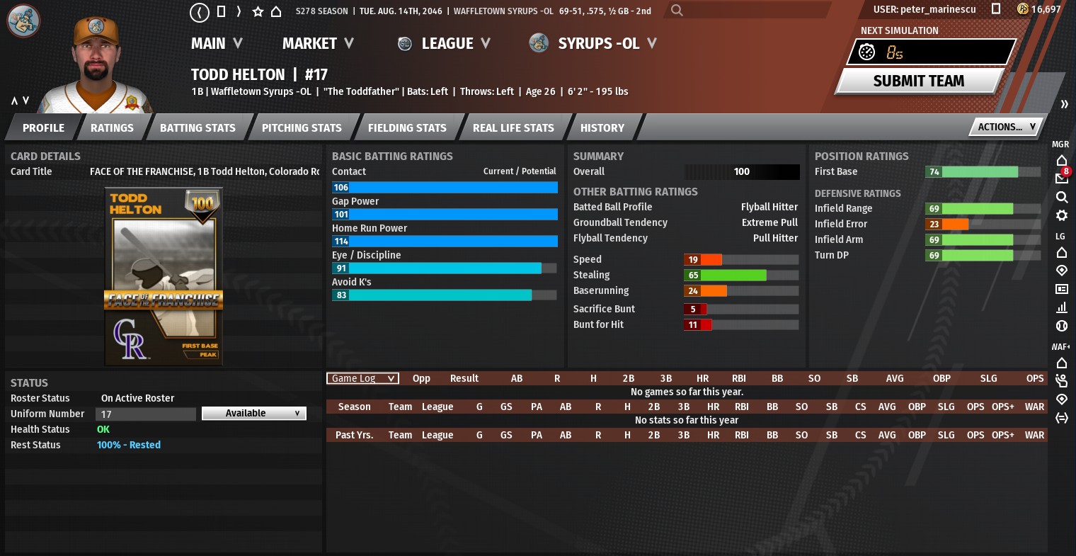 A rather forgettable season at the Gold tier came to a close with Waffletown finishing a distant fourth in the division with a 71-91 record. While their offensive-biased ballpark helped boost their rankings in average, runs scored, etc; it obviously had the opposite impact on the pitching and defensive side. Management will review the dimensions of The Spile for next season and decide if they will make any modifications.