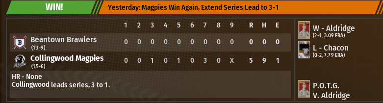 The Magpies have won 111 with 6 to play, but have not clinched the division because of the presence of the Budapest Red Devils. BDR is PL 2037 champs and overall they spent 8 seasons in Perfect including a stretch of 6 in a row, but once demoted have spent 10 seasons wandering in Diamond wilderness. By the All-Star break BDR had a 9.5 game lead over the Magpies, but they fought back to take the lead by 1 game as of this writing on the eve of a 3 game series with BDR. |