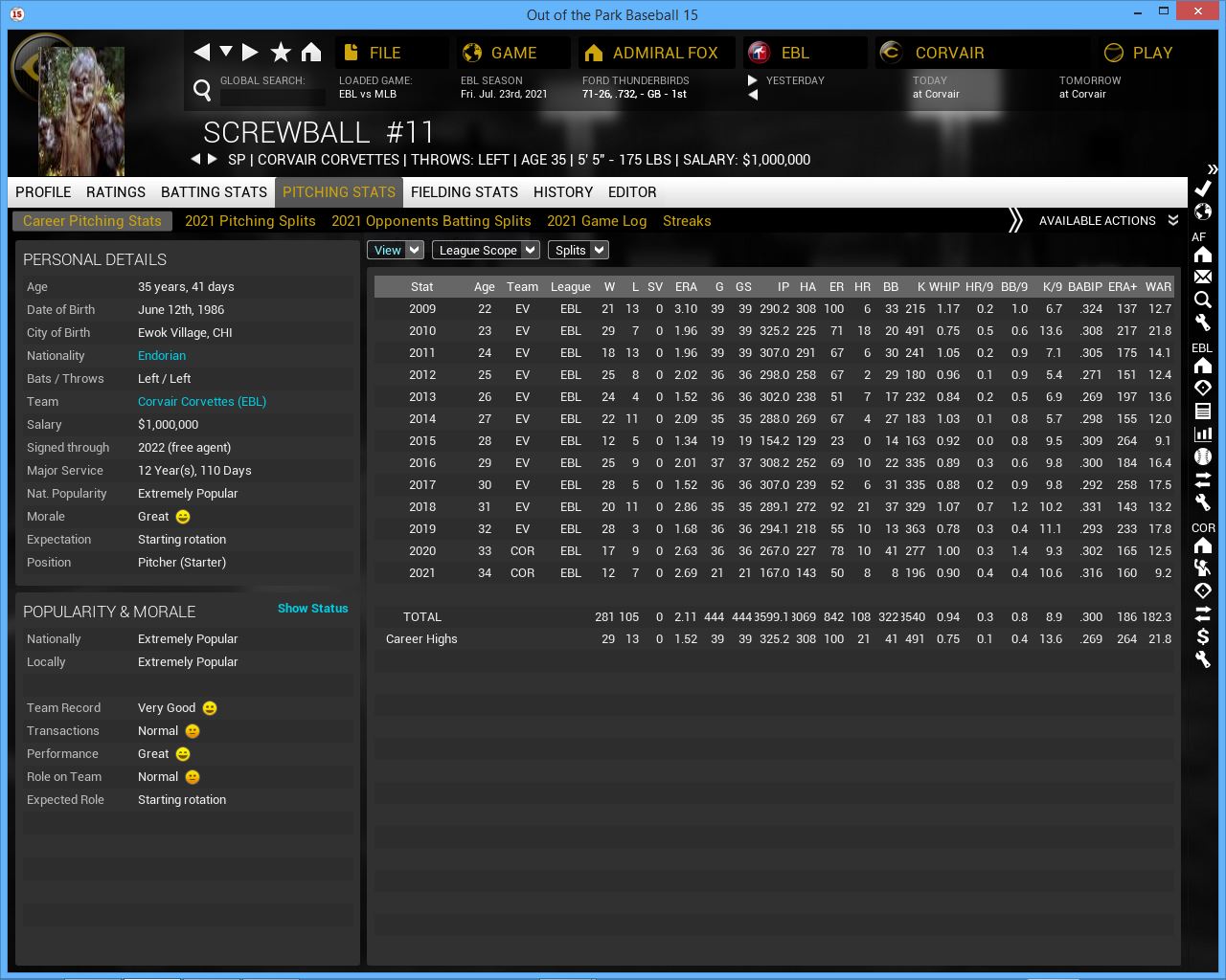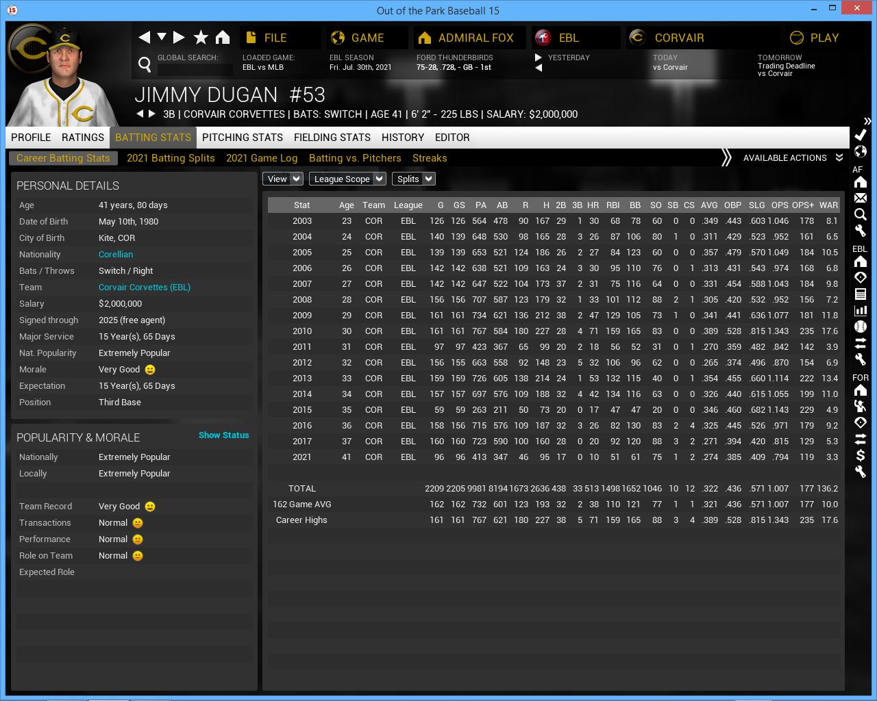 3 games @ Corvair. While we have a comfortable 9 game lead, we have struggled vs Corvair. We can either pad our lead and make it bigger or put the Vettes right back in the NL East race. 1B Bill Wyatt was recalled from AAA Dopson County and will start at 1st vs LHP.
