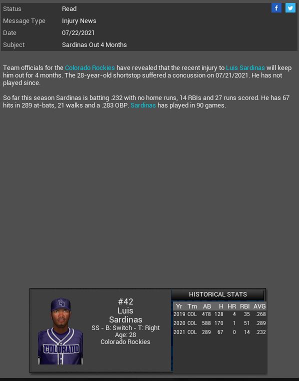 Colorado Rockies will miss SS Luis Sardinas for the season.