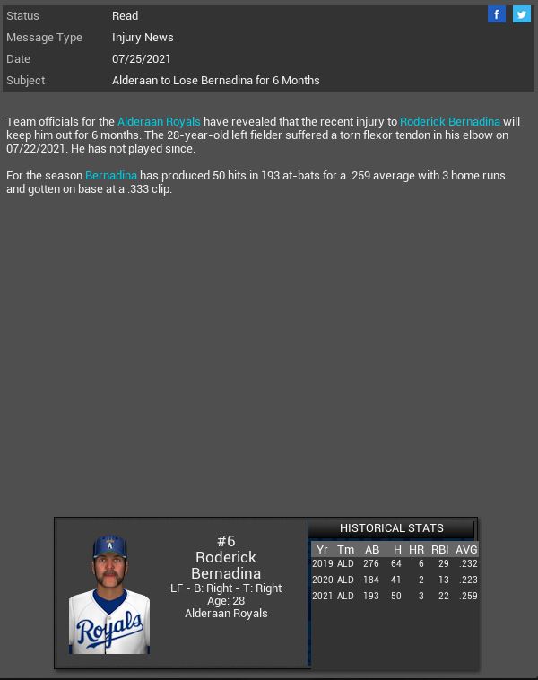 Alderaan Royals will miss LF Roger Bernadina for the season.