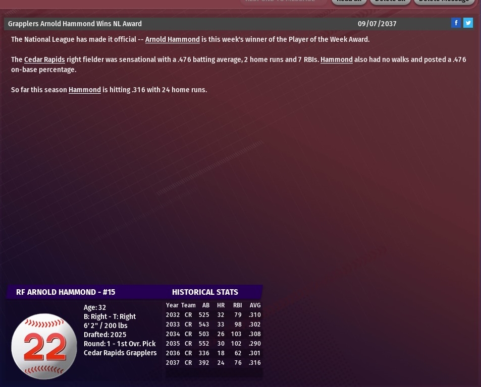 Rookie Mark Waterson had three hits, including a pair of home runs and collected five RBIs to power St. Louis to a 7-3 win over Milwaukee at Miller Park (2020). Nicolas Thibault gave the Crushers an early lead by hitting a solo homer off River Walkers starting pitcher Ming Xiang in the bottom of the first. But St. Louis tied it in the second, Waterson with an RBI double off Milwaukee starter Caleb Walker. It then took the lead in the third. Pitcher Ming Xiang led off with a single and scored on a Mark Herman double. Milwaukee tied it at 2-2 in the bottom of the fourth, belting out a trio of singles off Xiang including one which scored a run by Jose Nieto. Waterson put the Walkers in front for good in the seven with a one-out homer which ended Walker's outing. St. Louis broke it open with a four-run eighth. Marcos Francis drove in the first run with a single off reliever Andy Chavez. Waterson handled the other three with his second homer of the game and 20th of the season. Xiang (14-6) earned the win by allowing two runs on six his over 6.1 innings. He struck out two and walked one. Greg Sones got the final two outs of the seventh. Ron Cox pitched the eighth, allowing a run on an Andy Burhoe homer. Jose Tapia (0.2 IP) started the ninth and got two outs,but allowed a run. Elvis Pool faced one batter, pinch-hitter Corey Flowe, and struck him out for his first save at the major-league level. Last edited by rink23; 03-03-2022 at 04:35 AM. |