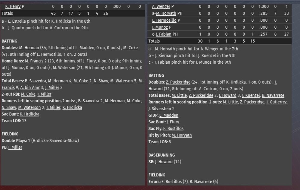 St. Louis closer Bobby Westerman came into the bottom of the ninth inning protecting an 8-7 lead, four batters later he had his MBL 10th blown save of the season as Judson Fabian hit a three-run home run to give Cleveland a 10-8 win at Cleveland Stadium (1980). Westerman got Edgar Bustillos to fly out to start the ninth. But Jon Howard followed with a single. Westerman than hit Javy Gutierrez with a pitch. Five pitches later, it was over, as Fabian drove 2-2 pitch 398 feet over the left-field wall to give the Juke Box Heroes the win. A back-and-forth contest, rookie Wen He had hit a two-run homer in the top of the sixth off Cleveland reliever Adam Wenger to give St. Louis a 7-6 lead. Bustillos took Ron Cox deep in the bottom of the seventh to tie it. St. Louis regained the lead in the top of the eighth. Josh Paul retired the first tow baters before giving up a double to Jordan Quinto. A wild pitch moved Quinto to second and he scored on a Bob Saavedra single. It was a short night for Heroes starting pitcher Antono Alguezes, who gave up five runs on seven hits in 2.1 innings. But the Cleveland bullpen managed to keep it close. Nate Wilson finished the third inning and got the game to the sixth without allowing a run. Wenger gave up two runs in the sixth. But after that, it was nothing but blank frames for St. Louis as Leo Hermosillo, Josh Paul and Jonah Mills all put up scoreless innings. The win went to Mills (2-1). |
