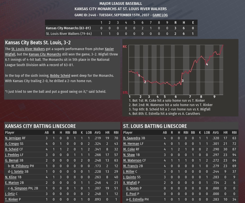 Tied 3-3, Milwaukee scored a pair of runs in the bottom of the fifth inning and went on to defeat St. Louis 5-4 at Miller Park (2020). The win gave the Crushers wins in final two games of the three-game series. The game had been tied 3-3 win since the River Walkers scored a pair of runs off Milwaukee starting pitcher Tony Lujano in the top of the fourth. Nick Shaw provided the first run with a solo homer. Rookie Wen He, making his major league debut, later doubled and scored on a two-out single by Abdul-Nasser bin Amr. Andy Burhoe got the Crushers rolling in the bottom of the fifth against St. Louis starter Xavier Wigfall with a lead-off double. He scored on a one-out single by Alvaro Lovato. Corey Flowe followed with another single, putting runners on the corners. Lovato scored when Ryan Edwards hit into a fielder's choice. Eddie Estrella led off the sixth with a homer off Lujano to pull St. Louis to within a run. That, however, would be the end of the scoring for the Walkers. Lujano (10-10) allowed four runs on seven hits in 5-2 innings but still earned the win. He struck out four and didn't walk a batter. Ed Sutherland completed the sixth inning for Milwaukee. David McLoughlin, Jason Pappas and Dave Araya all pitched scoreless innings in relief. Araya upped his save total to 13. |