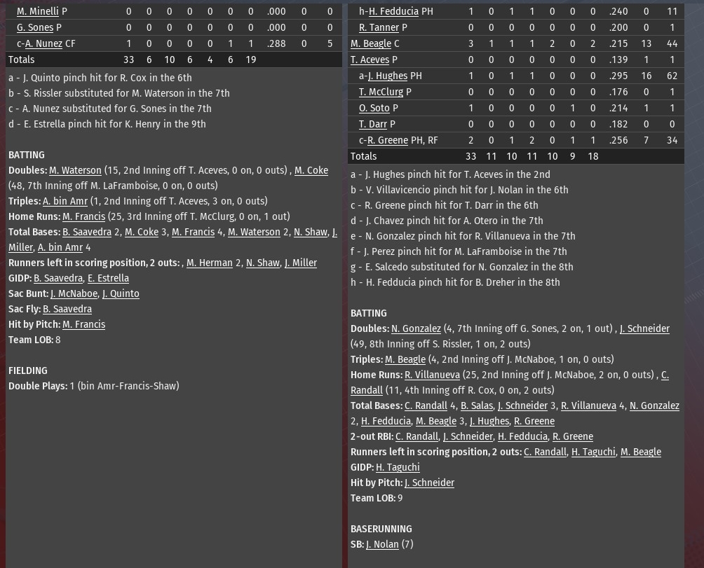Tied 3-3, Cleveland roughed up St. Louis reliever Elvis Pool for three runs in the bottom of the seventh inning and the Juke Box Heroes went on for a 6-3 win at Cleveland Stadium (1980). The victory gave Cleveland a split of the four-game series. Pool had not given up a run in 11 outings since being called up by the River Walkers on August 26, but this game was different from the first batter. That would be, Luis Ruiz, who Pool hit with an 0-2 pitch to set the Heroes outburst in motion. Joey Kiernan followed with a triple to put Cleveland ahead 4-3. When Mac Horvath followed with a run-scoring double, Pool's day was done and the Heroes led 5-3. Horvath later scored on a two-out wild pitch by Maximilliano Minelli. Both teams had three-run innings earlier in the game. St. Louis tallied three times in the top of the third off Cleveland starter Hugo Vasquez. The Heroes evened in the bottom of the fourth against River Walkers starter Jesse McNaboe. Will Holland plated two of the runs with a double. Ruiz took care of the third with a single. Vasquez worked the first six innings, allowing three runs on eight hits. He struck out six and didn't issue a walk. After that, it was a string of scoreless innings from Adam Wenger, Nate Wilson and Josh Paul to close the game. Wenger (2-6) earned the win. Paul notched his fourth save. |