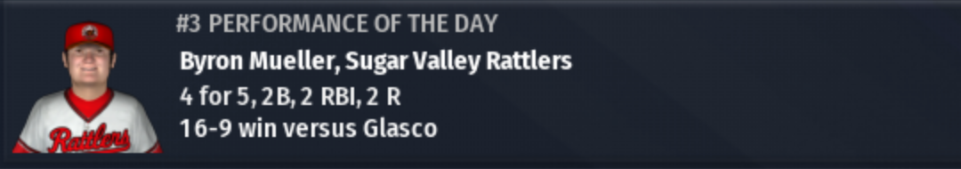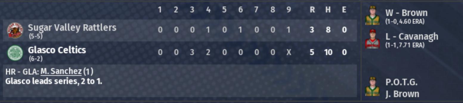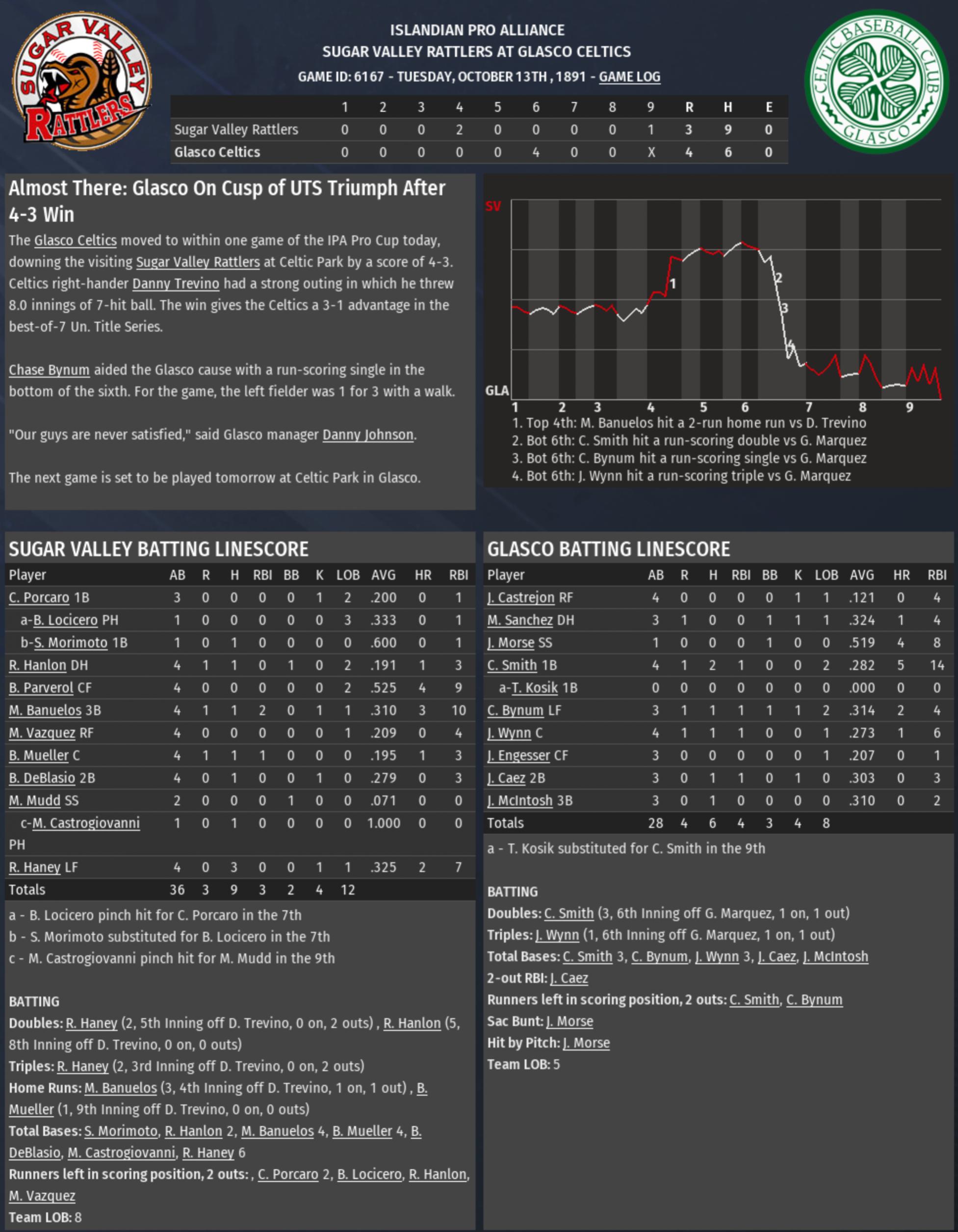 As for Glasco and Sugar Valley, you know who I'm rooting for there. Walton gave it his best shot, I'm sure, against Sugar Valley, in game seven, but perhaps his defense let him down there at least a little, too. Hopefully he'll play in 1892, at least, if not past then, for his playing career. Whether it's with Volusia or someone else, but it's probably much more likely that he'll retire in very short order, I think. Both current series should be good and close ones, most likely. While Sugar Valley may be favored, on paper, I still think they're not very experienced and all, when it comes to the playoffs and all. OOTP may not take such things into account, when they run the games in question, but if these were real teams, it would probably be a major advantage for Glasco that they have so many playoff-tested players on their roster here, if I'm not too mistaken here about such things. I still say that the Pro Cup will be contested by the Redbirds and Celtics. If it is, I would still believe that it would quite potentially be a tossup as to who would win the Pro Cup, in that case, here, with perhaps a bit of an edge for Denton City, somehow. CD out.