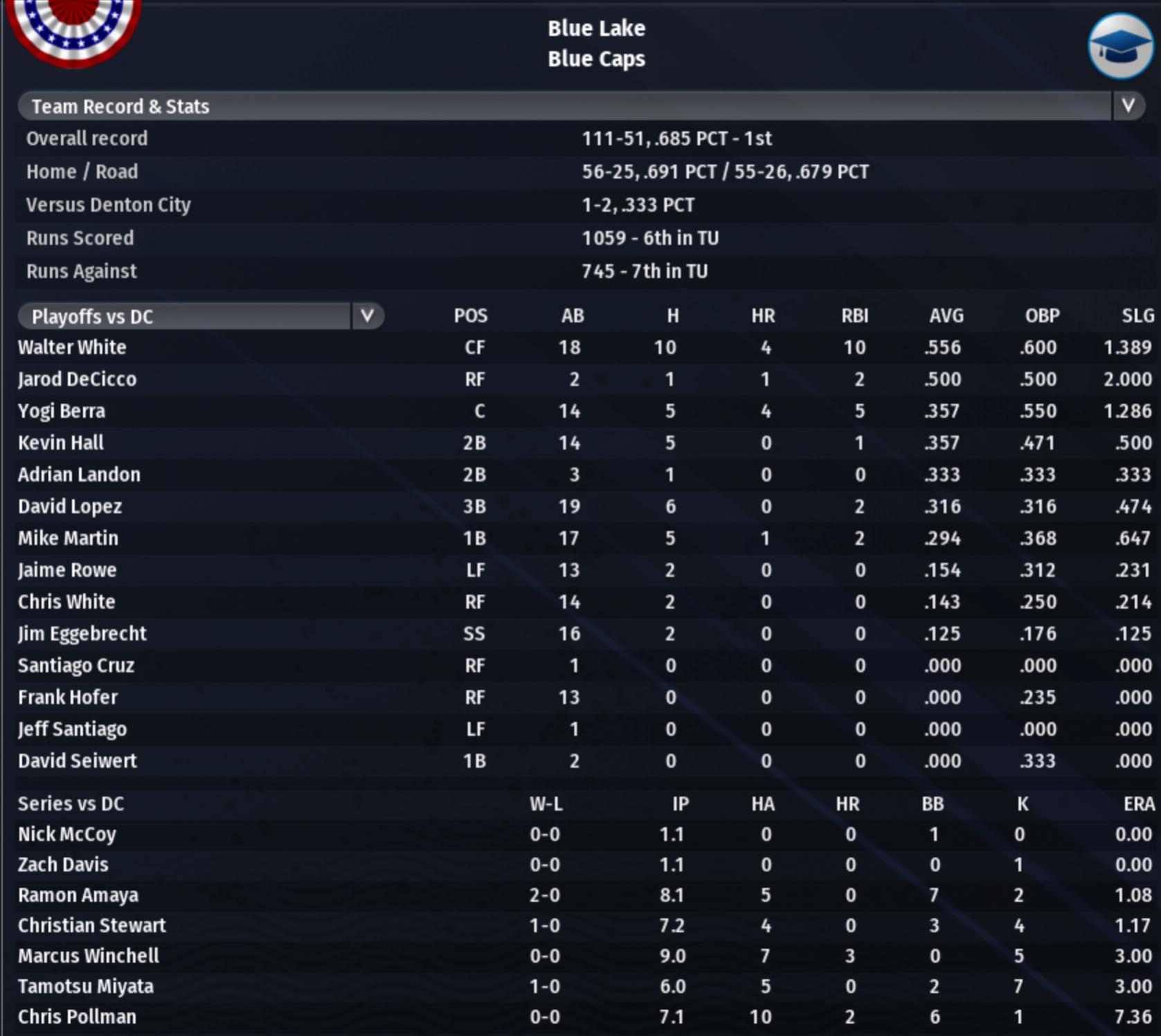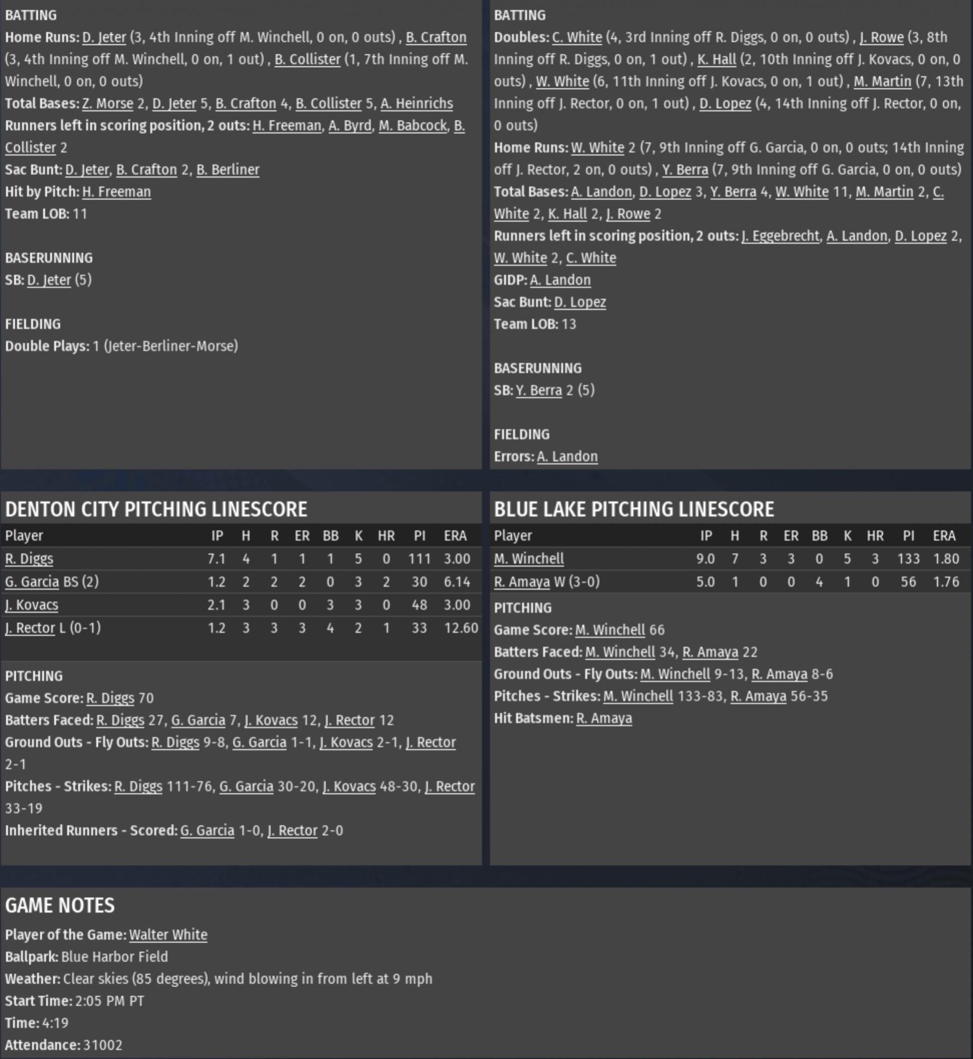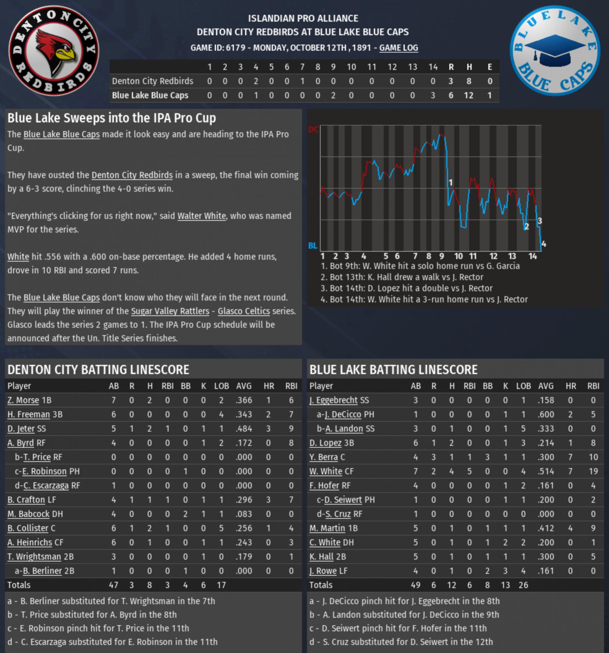 Blue Lake has shocked Denton City in a 4-game sweep. The last game was a 14-inning marathon, won by Heisenberg on a walk-off 3-run home run. Walter White was the MVP of the series. The Blue Caps have won their 3rd TU pennant, their first in 12 seasons. They will be trying to win their 2nd Pro Cup title. Their lone title came back in 1875, |
