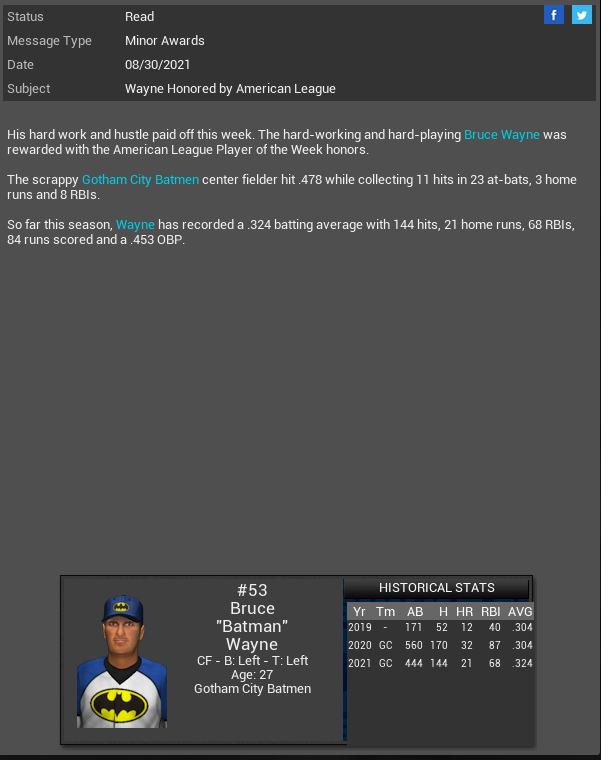 Bruce Wayne is named EBL AL POTW. Rocky Top Rockies 2B Ehlo is named NL POTW. NY Yankees RF Jeremiah Bernard is named MLB AL POTW.