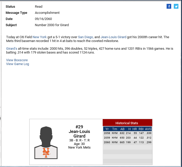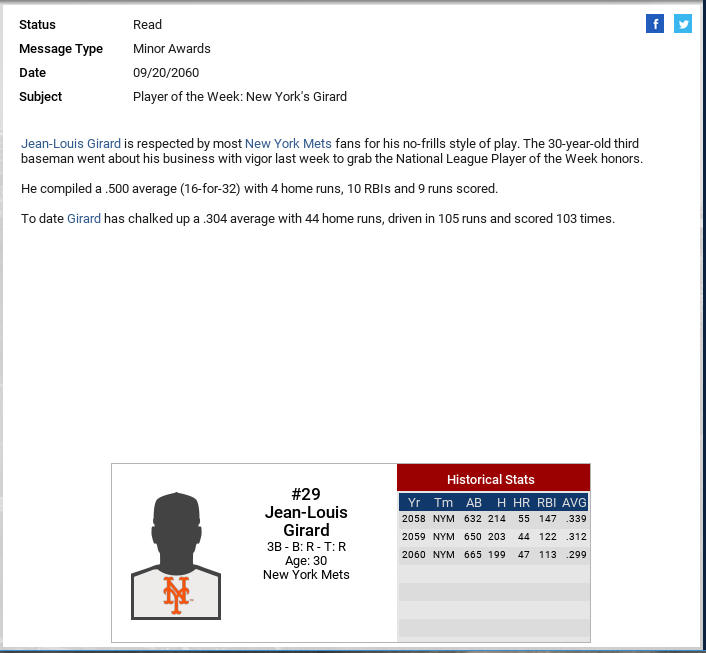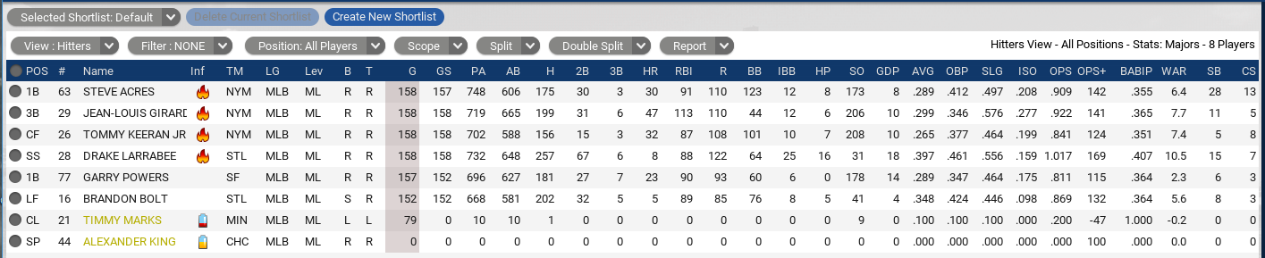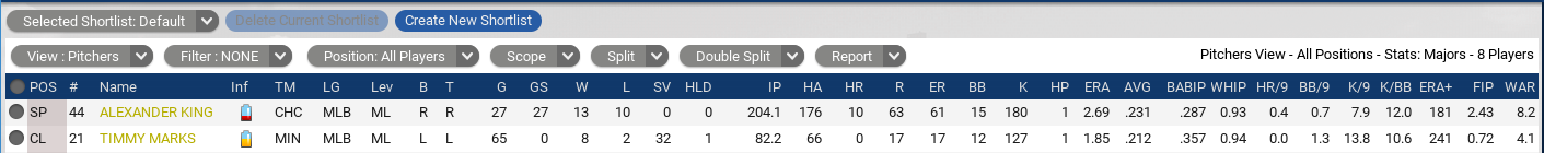 Nickname: Boomtown Birthday: HS 9/2 Hometown: Souix City, IA Uniform Number: 23 Leadership: 200 Desire for Winner: 25 Loyalty: 175 Greed: 0 Work Ethic: 200 Intelligence: 200 Adaptability: 100 Controversy: 0 Handle Success: 100 Handle Failure: 150 Handle Critics: 100 Height: 6'4" Weight: 215 Bats: R Throws: R Position: SP Pitches: Fastball: 60/150 Screwball: 60/150 Curveball: 60/100 Changeup: 60/100 Movement: 90/150 Control: 55/125 Stamina: 150 Hold Runners: 50 Total: 350/950 Speed and Defense: Good mix of speed and defense This is for when you add more prospects. Sent from my SM-J700T1 using Tapatalk Last edited by PFCtaylor; 09-05-2017 at 07:15 PM. |