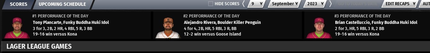 Gold beer award: Tony Plancarte of Funky Buddha Huki Idol - Plancarte went 3-for-3 with a double, 2 home runs, 4 RBIs and 5 runs scored in a 19-16 win over Kona Pipeline Silver beer award: Alejandro Rivera of Boulder Killer Penguin - Rivera went 4-for-4 with a double, a home run, 5 RBIs and 3 runs scored in a 12-2 win over Goose Island Goslings Bronze beer award: Brian Castelluccio of Funky Buddha Huki Idol - Castelluccio went 2-for-3 with a home run, 5 RBIs and 3 runs scored in a 19-16 win over Kona other scores from around the league: -Tree House Tornado defeat Foulmouthed Malcontent 10-4 -Twisted X Chupahopra defeat Ballast Point Commodores 3-0 -Scorched Earth Giant Killer defeat Great Raft Reasonably Corrupt 3-2 -Horsefly Jazzy Razzy vs Mispillion River Space Otters postponed due to rain -Thimble Island Kraken defeat Terrapin Hopsecutioner 3-1 -Rabid Dwarves of Doom defeat Prairie Sun Mad Hopper 7-2 -Russian River Blind Pig defeat Chafunkta Kingfish 7-0 -Toboggan Lunatic Fridge score 3 in the bottom of the 9th for a walk off 5-4 win over Palmetto Ghost Rider -Stony Creek Crankenstein defeat Three Floyds Apocalypse Cow 3-2 -Crooked Crab Furious George defeat Tattered Flag Ma of War 8-6 -Odious Cellars Rubied Perspective defeat Jester King Das Wunderkind 5-3 in 10 innings -Four Hands Typhon defeat Smog City Sabre Toothed Squirrels 6-3 -Sleeping Giant Beaver Duck defeat Red Rock Elephino 5-3 -Charleville Half Wits defeat Meadowlark Mob Barley 6-3 -Laughing Sun Red Dwarf defeat Texas Leaguer Chin Music 5-4 -Waikiki Ala Moana defeat Sierra Nevada Narwhals 6-5 -Daft Badger Hoppypotamus defeat Firefly Hollow Dire Chinchilla 4-3 -Weyerbacher Blithering Idiot defeat Big Sky Trout Slayer 5-2 |
