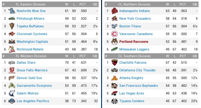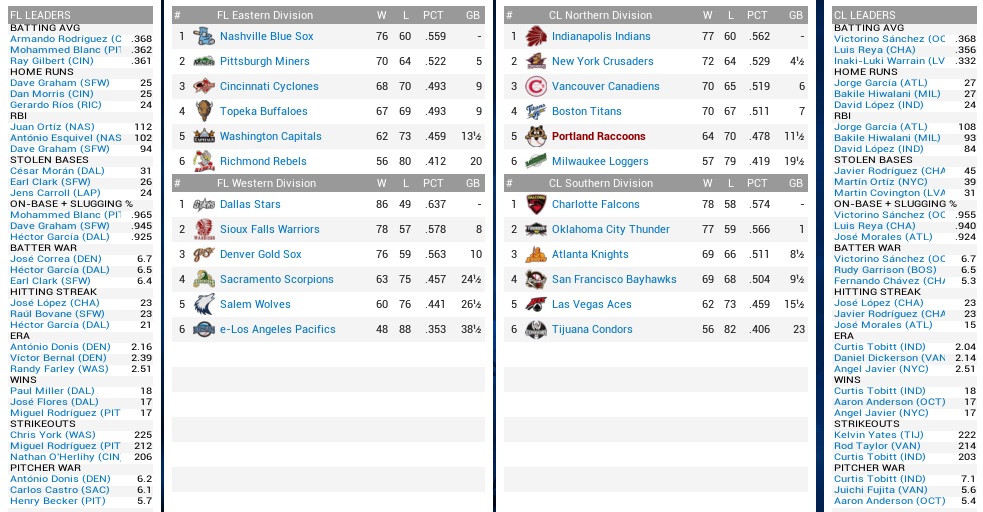 Portland Raccoons, 92 years of excell-.... of baseball: Furballs here! 1983 * 1989 * 1991 * 1992 * 1993 * 1995 * 1996 * 2010 * 2017 * 2018 * 2019 * 2026 * 2028 * 2035 * 2037 * 2044 * 2045 * 2046 * 2047 * 2048 * 2051 * 2054 * 2055 * 2061 1 OSANAI : 2 POWELL : 7 NOMURA | RAMOS : 8 REECE : 10 BROWN : 15 HALL : 27 FERNANDEZ : 28 CASAS : 31 CARMONA : 32 WEST : 39 TONER : 46 SAITO Resident Mets Cynic - The Mets from 1962 onwards, here. Last edited by Westheim; 09-07-2015 at 05:13 PM. |