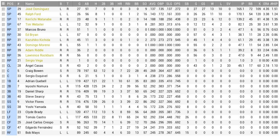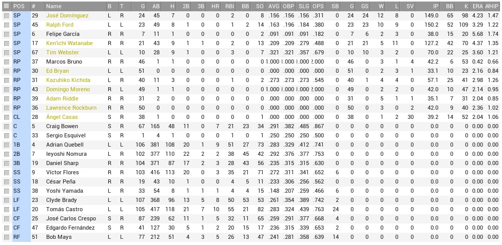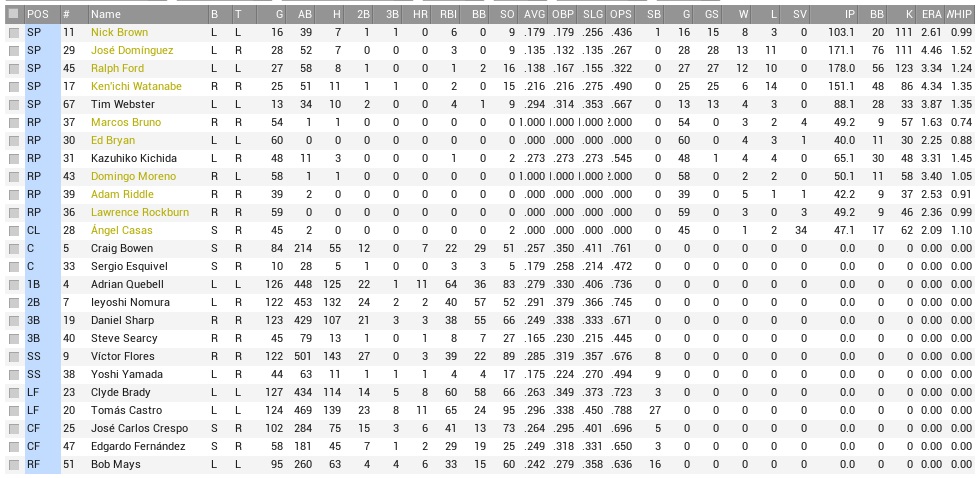 ![]() For the 20-14 thing ... I'd prefer 21-13 ... and ... at least we will have Nick Brown going rather than continuing to give starts to pushovers like Felipe Garcia. No, the pushovers Webster, Watanabe, and Dominguez have not been replaced yet. Maybe we can find a few pitchers in our christmas stockings come December, and as always, everything will be well next year. (You know that Ralph Ford will be a free agent, don't you?)