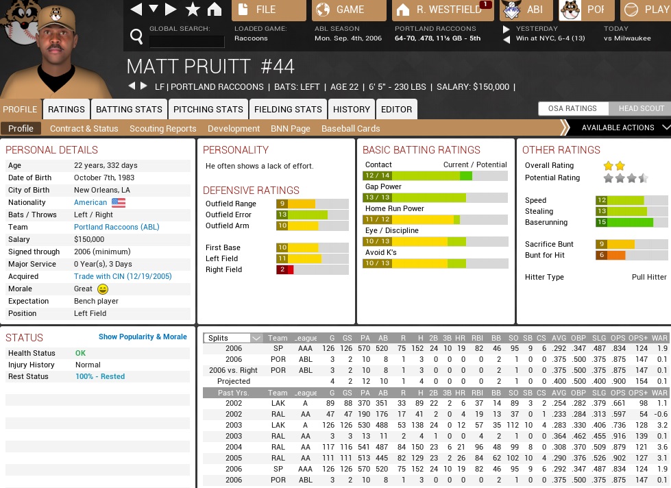 Raccoons (64-70) vs. Loggers (57-79) – September 4-7, 2006 Four games in four days with the Loggers, the easy part of the whole thing (not because of the Loggers, but because of the intricacies of the space-time-continuum. They were soundly in last place (though a sweep could to a lot with that soundly part), not hitting, nor pitching. They had the least runs scored, and the third-most runs allowed with a hefty -149 run differential. There was just nothing on this team that even a mother could love. Yet they had taken eight of eleven from the Coons… Projected matchups: Nick Brown (8-4, 2.89 ERA) vs. Roy Thomas (5-8, 6.32 ERA) Ralph Ford (12-10, 3.52 ERA) vs. Martin Garcia (10-5, 2.69 ERA) Jose Dominguez (13-11, 4.36 ERA) vs. Junior Diaz (10-11, 3.82 ERA) Kenichi Watanabe (7-14, 4.15 ERA) vs. George Norris (6-13, 5.72 ERA) Game 1 MIL: LF Bayle – SS Tolwith – CF T. Austin – RF Hiwalani – 2B B. Hernandez – 1B Wheaton – C T. Phillips – 3B O. Rios – P R. Thomas POR: 2B Nomura – SS Flores – CF Crespo – RF Brady – 1B Quebell – LF Pruitt – 3B Sharp – C Bowen – P Brown The Loggers had a rather dark hour at the start of the game, making three errors in the first two innings, which in addition to unsound pitching by Thomas (five hits, one walk) led to five runs, the amount of which that were actually earned was not easy to decipher. Two errors were made by normally sure-handed Bakile Hiwalani in rightfield. Hiwalani would single in the Loggers’ first run in the fourth inning, plating Aaron Tolwith, who had been plunked by Nick Brown. And we had seen that before… The run just surrendered was put back onto the board on Flores’ groundout in the bottom of the same inning, and the Raccoons exploded for four more runs on four extra base hits in the bottom 5th. Brady homered, Quebell and Pruitt doubled, and then Bowen homered to make it a 10-1 game. Vic Flores cost Brownie an unearned run in the seventh inning with an eror on Bartolo Hernandez’ grounder to start the frame. We tried to push Brown for eight, which backfired. With Tim Austin on second base and two outs, Hiwalani hit a double to get onto Brown’s line, who then walked a pair as he was clearly out of bullets. Law Rockburn appeared to surrender Tom Phillips and to keep the line fairly clean. In the bottom line of the score, another crooked number appeared in the bottom 8th against poor Francisco Gonzalez. He allowed a 2-out run when Fernandez singled home Pruitt, who drew the throw from Jimmy Bayle, but was well safe, with Bowen and Fernandez moving to third and second base, respectively. Yoshi Nomura, slumping, grounded to Tolwith, who made the fourth painful error for the Loggers on the day, throwing that grounder away. That plated two runs, 14-3, and then Vic Flores came not only through, but outta here. The Raccoons failed to score only in the third and sixth innings in a terrible thumping: 16-3 Brownies!! Flores 3-6, HR, 3 RBI; Crespo 2-4, BB, 2 RBI; Brady 3-5, HR, RBI; Quebell 2-5, 2B, RBI; Pruitt 3-4, BB, 2 2B, 3 RBI; Bowen 2-3, 2 BB, HR, 2B, 2 RBI; Fernandez (PH) 1-1; Brown 7.2 IP, 6 H, 3 R, 2 ER, 2 BB, 8 K, W (9-4) and 2-4; Note to all preschool Loggers fan kiddos: 16 is a number that comes well, WELL after 3. (grins) I will pay for that, but we casually jumped to ninth in runs scored. Adam Riddle was placed on the disabled list before the Tuesday game. He had suffered a forearm strain. It was extremely unlikely that he would return this year. We added Matt Cash to the roster despite him being thoroughly underwhelming. We were running out of decent 7th inning relief options… Game 2 MIL: LF Bayle – 2B B. Hernandez – CF T. Austin – RF Hiwalani – 1B Batlle – 3B O. Rios – SS M. Clark – C T. Phillips – P M. Garcia POR: SS Flores – CF Fernandez – 3B Sharp – 1B Quebell – C Bowen – RF Mays – LF Lugo – 2B Ingram – P Ford Ralph Ford almost cried when he got wind of this lineup, but I was trying to balance facing a left-hander with giving a few guys a day off and at the same time prevent the lineup being overtaken by stragglers. You may note that Quebell has recently sat regularly against left-handers, but imagine him being replaced with Searcy. (shudders) Yet, if Ford pitches like last time out, a lineup with vintage 1985 Daniel Hall, Mark Dawson, and Tetsu Osanai couldn’t save him… Ford would score the first run of the game, hustling home from first base on Eddie Fernandez’ third inning double that went all the way to the wall in left center and then bounced some. For a while it appeared that this one run might actually be enough. Ford was in the zone, and whenever the Loggers were thinking he would remain there, he threw them a hook. Through five, he allowed one hit against seven strikeouts, and when Tim Austin singled in the sixth he was promptly caught stealing. Meanwhile the replacement level lineup – as was to be expected – failed to keep a 16 runs pace, and through six innings they had only four hits and a walk to their credit. Hiwalani hit a leadoff single in the top 7th and moved up on groundouts by Batlle and Tolwith. Mark Clark was a soft-hitting, but right-handed shortstop, Ford was on 100 pitches, yet there was nothing indicating that anything particularly bad would – knock! Line drive to left! Flores – HAS IT!! Uh, that was too close for comfort. Ford would retire Phillips in the eighth before Chris Parker reached on an infield single on the oddly slow reacting Tom Ingram. Marcos Bruno replaced Ford with the tying run on base again and got through the inning. Clyde Brady pinch-hit for Bruno to start the bottom 8th, singled, then was caught stealing when Vic Flores swung through a breaking ball from Gabriel Garcia, THEN doubled on the next pitch. Clark’s error allowed Fernandez to reach base and Flores to go to third, when Matt Pruitt hit for Danny Sharp and peppered a pitch into right center for an RBI double, but he and Fernandez were st