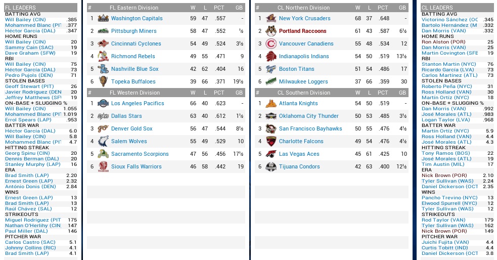 The season series was split through 12 games, which was doubly sad given that the Raccoons had started out 5-0 against NYC at one point. This was the last series in New York between the teams, but we would play another 3-set in Portland on the second-to-last weekend of the season. To be realistic, the Raccoons need to do better than 4-2 over the remaining games to get even remotely close to contention again. The Crusaders were second to only us in runs allowed, while they scored soundly the most runs in the Continental League. But they had lost Stanton Martin to injury a week ago, so there was that… Projected matchups: Javier Cruz (8-9, 3.26 ERA) vs. Elwood Spurrell (13-8, 3.88 ERA) Cássio Boda (4-2, 4.46 ERA) vs. Ken Maddox (7-8, 4.70 ERA) Nick Brown (11-5, 2.32 ERA) vs. Pancho Trevino (15-9, 3.37 ERA) That’s three right-handers, which was no surprise. They had no left-handed starters. Game 1 POR: CF Castro – 3B Sharp – LF Pruitt – RF Alston – 1B Quebell – 2B Nomura – SS Howell – C De La Parra – P Cruz NYC: CF R. Pena – SS J. Hernandez – LF M. Ortíz – 2B Caraballo – 3B Reece – 1B Batlle – RF MacKey – C D. Anderson – P Spurrell This was the first of three mortally important games. If the Raccoons wanted the slightest sniff of another chance at the playoffs, they had to win the series, and better sweep it. Too bad Cruz allowed two runs on a few well-placed singles right in the first inning. The Coons’ first five batters went down in order before Yoshi hit a soft single to right in the top 2nd. Howell and De La Poland also hit singles, and then even Cruz came up with a soft line over Francisco Caraballo into shallow right that scored Rob Howell and tied the score at two. Tomas Castro came up, he with the winning streak, and rocketed a pitch to deep right, where Matt MacKey threw up his arms in disgust as the ball broke the plane of the wall: 3-run homer, Coons up 5-2! While the initial impression had been that Cruz wasn’t up to the task, both pitchers ended up in a situation with runners on the corners and one out in the third inning. Elwood Spurrell threw a run-scoring wild pitch, while Cruz struck out Sonny Reece and Paco Batlle to get out of the jam, and Spurrell’s nightmare continued long enough to allow another homer, a solo shot, to Tomas Castro in the top 4th. The Crusaders hit for him in a 7-2 deficit in the bottom 4th, and Zak Davidson struck out in his spot. Not that Cruz had a stellar game. He allowed a run in the fifth, which he took 102 pitches to complete and then was removed after Daryl Anderson singled with one out in the sixth. Law Rockburn replaced him, but gave up a single to Marc Williams and a double to Roberto Pena as the Crusaders scored two runs and got back to 7-5. The Coons would strand three runners in scoring position between the top 7th and 8th before they arrived at the critical junction in the bottom 8th. Donald Sims had already gotten three outs, and the righty Anderson was up, with reliever Lorenzo Flores behind, and lefty leadoff man Roberto Pena after that. They had two left-handers on the bench, so either way we were likely screwed. In that case, protect Sims for another game in the set, and move to a right-hander. With Huerta in the back of our heads reserved to perhaps pitch long relief for Boda tomorrow, Marcos Bruno came in. Anderson popped out to Alston, and as expected, endless coon schreck Ming Kui appeared in the box, but grounded out to Nomura for once. The top 9th saw Alston walk against Iemitsu Rin with two outs before Correa hit for the luckless Quebell against the left-hander and sent a bloop into shallow right that bounced off MacKey’s ugly nose for an error that put the runners in scoring position. Ayers batted for Nomura, pulled an 0-1 pitch to left, and that was high, deep, and gone!!! 10-5 Raccoons!! Castro 3-5, 2 HR, 4 RBI; Correa (PH) 1-1; Nomura 3-4; Ayers (PH) 1-1, HR, 3 RBI; Bruno 1.2 IP, 1 H, 0 R, 0 BB, 0 K, SV (6); After this game, we placed Manuel Gutierrez on waivers to get Luke Black back onto the team. He just seemed to have found that extra base hit stroke in AAA, and I wanted him to show that here. If at all, humanely, possible. Thanks. Game 2 POR: CF Castro – 3B Sharp – 1B Pruitt – LF Alston – RF Black – 2B Nomura – SS Howell – C De La Parra – P Boda NYC: CF R. Pena – RF MacKey – LF M. Ortíz – 2B Caraballo – 3B Reece – 1B Batlle – SS Davidson – C D. Anderson – P Maddox Roberto Pena homered on Boda’s first pitch, and that was that. The Crusaders loaded the bases after that, but left them loaded in the bottom 1st. While the Coons’ lineup showed an uncanny ability to ground out to Sonny Reece to leave a variable number of runners on base, Boda’s only ability was to allow hard deep drives. That wouldn’t go well forever, and sooner or later there would be noise again, like on Daryl Anderson’s RBI triple in the bottom 4th. Sharp’s clumsiness would allow Pena to plate Anderson with an infield single, giving the Crusaders a 3-0 edge. The Coons managed to curb their rally attempts early in this game. They had Howell on in the fifth, and De La Pogo hit into a double play. They got Alston on with a leadoff single in the seventh, and Black grounded to Reece for two. Bottom 8th, Derrek Fredlund was almost out of the inning. Despite Caraballo’s leadoff single, the Crusaders still had their runner on first with two outs, when Fredlund balked and gave them a free base. He had thrown a pitch without touching the rubber, the stupid kiddo. Sure as damned hell, Zak Davidson singled the runner in on the next pitch to put the Crusaders up 4-0. In the ninth inning, the Furballs faced Scott Hood for the second inning. Castro hit a leadoff single, extending a hitting streak to 16 games at the last opportunity, but it was a long way to get the tying run to the plate, and it grew just longer when Sharp bounced a 3-1 pitch into a double play. 4-0 Crusaders. W
