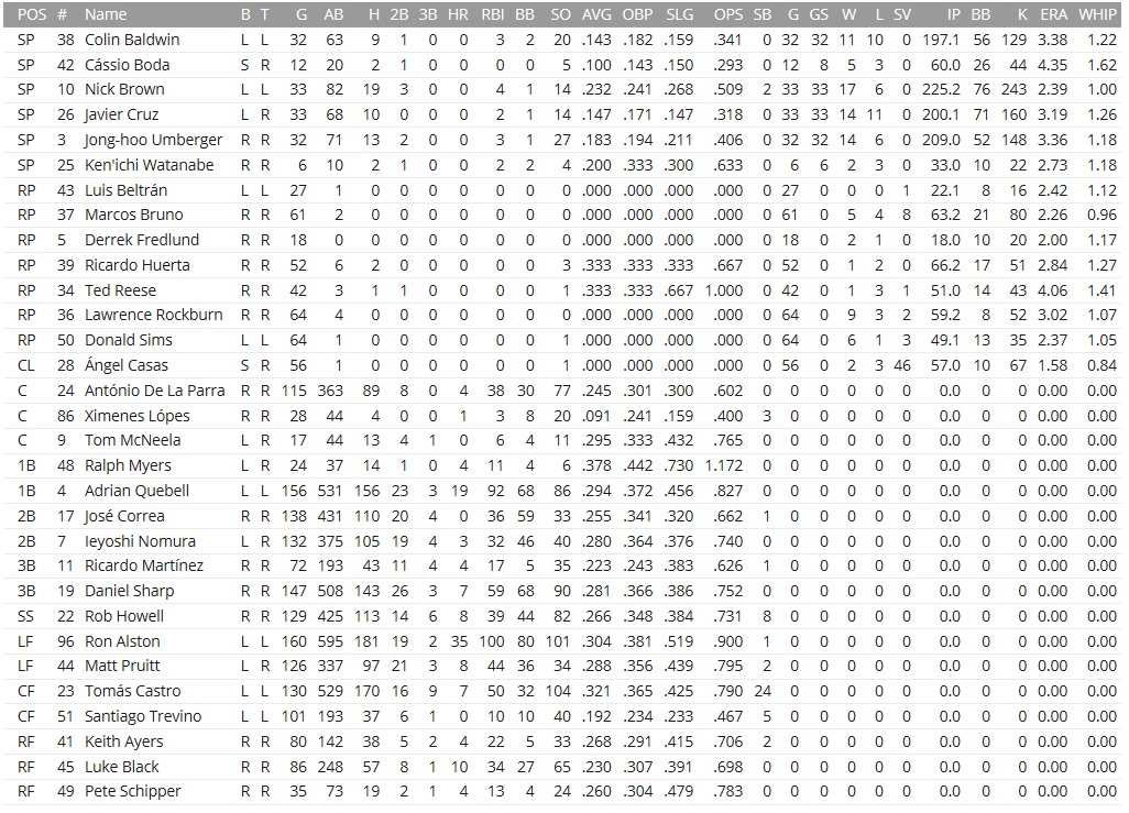 Here comes another losing team from the CL South, one that we are so far not posting a losing record against this year, but at 4-2, anything can happen. They had the worst batting average (with the Raccoons giving them a good run by now), but were eighth in runs scored (hum…), while they were allowing the fourth-least runs, but overall their run differential was -26 (Coons: +51). Projected matchups: Nick Brown (11-6, 2.68 ERA) vs. Reynaldo Rendon (6-8, 3.74 ERA) Colin Baldwin (9-8, 3.40 ERA) vs. G.G. Williams (2-9, 5.16 ERA) Jong-hoo Umberger (10-6, 3.43 ERA) vs. Richard Williams (6-15, 5.03 ERA) G.G. is the only lefty scheduled to face the sorry bunch of losers right now, but of course September 1 is just 24 hours away. Game 1 SFB: 1B Catalo – 2B J. Perez – RF D. Cameron – 3B D. Lopez – C Rosa – LF F. Guerra – SS McCullough – CF Covington – P Rendon POR: LF Castro – 2B Nomura – RF Alston – 1B Quebell – 3B Sharp – SS Correa – CF Trevino – C De La Parra – P Brown I told Slappy to erect a screen in front of the big windows in my office, which I hadn’t left in four days, so I and Honeypaws wouldn’t have to watch the game. But Slappy didn’t do it, which was no surprise at all. Nobody ‘round here did what I expected of him, ever. Which brought us right to Nick Brown, who continued were he had left off on that sad Wednesday in New York, issuing two walks and pitching in many 3-ball counts in the first three innings, while striking out only Rendon (but at least that was with runners in scoring position to end the second). The Coons pulled two runs out of a hat in the bottom 3rd, with a Yoshi double the key piece in the inning. Brown struck out Guerra, McCullough, and Covington from the fourth into the fifth before allowing a 2-out double to Rendon and walking Leborio Catalo and Jose Perez. Don Cameron kindly grounded out to Quebell to strand the runners. Brown wasn’t entirely useless, however, leading off the Coons’ fifth with a line drive single to right, which allowed him to score on Tomas Castro’s home run, 4-0. Say, Tomas, where’s that power been all year!? Brown somehow got through seven innings despite as many walks as strikeouts (four apiece), but the Bayhawks got only five hits off him, one of which being a David Lopez double to start the sixth inning, and the Birds maneuvered him around to score, so Brown left the game with a 4-1 lead. Huerta pitched the eighth with minimal disturbance, but Angel had thrown almost 40 pitches in two days and Bruno was assigned the ninth inning. Bruno sat down Fernando Guerra before McCullough singled. With two outs, things got really tight. Omarion Thompson hit a bloop that bounced between Castro and Sharp, and then Leborio Catalo singled up the middle to represent the tying run on base. Jose Perez sent a drive to center, Trevino came in, and … caught it. 4-2 Brownies. Castro 2-4, HR, 2 RBI; Alston 2-3, BB; Sharp 2-4; Brown 7.0 IP, 5 H, 1 R, 1 ER, 4 BB, 4 K, W (12-6) and 2-3, 2B; With August 31 in the books, the Loggers were eliminated from playoff contention, and rosters expanded for September play. The Raccoons added a select few players. SP Kenichi Watanabe (10-8, 3.70 ERA) was the last AAA backup to get a shot in 2009, Ted Reese rejoined the pen with a 3.29 ERA in AAA, and over 4 in the bigs. Ralph Myers (.283/.402/.417, 14 HR, 57 RBI) was added as pinch-hitter, as well as Ricardo Martinez (.399/.454/.611, 6 HR, 39 RBI) and Pete Schipper (.279/.367/.419, 1 HR, 6 RBI in 13 G). Game 2 SFB: SS McCullough – 2B J. Perez – RF D. Cameron – 3B D. Lopez – C Rosa – CF DeBoer – 1B A. Gonzalez – LF Covington – P G.G. Williams POR: CF Castro – SS Howell – LF Alston – RF Black – 1B Quebell – 2B Correa – 3B Sharp – C De La Parra – P Baldwin Baldwin pitched six innings, allowing a walk in every inning but one, and wouldn’t have been booked for a run if not for a passed ball on De La Plough with two out and Don Cameron on third base. That gave the Baybirds one run to the Coons’ none, as they had only managed to pile two hits on G.G. Williams through five innings. Baldwin retired two more in the top 7th before yielding to Fredlund, who allowed a terrible drive to right to McCullough, but that was sucked up by Luke Black’s glove. The Coons’ hour appeared to have come in the bottom of the seventh with leadoff walks to Quebell and Correa. Sharp grounded out before that catcher impostor drew another walk to load them up. Ricardo Martinez batted for Fredlund, drove the ball to deep left, but had it caught by Martin Covington on the warning track. Still, Quebell tagged and scored, at least tying the score, but Castro failed and flew out to shallow left. And so G.G.W. kept pitching into the eighth. Howell reached on a bloop single before Alston beat Jimmy DeBoer with a drive to center for a double. Howell was held ahead of the throw, but with two runners in scoring position and no outs, even I liked our chances. Black was walked intentionally, Quebell popped out, and I stopped liking our chances. Keith Ayers batted for Correa, fell behind 1-2 before ripping a ball to center. Going, going, GONE!! GRAAAAAAAAND SLAAAAAAAMMMMM!!!! That wasn’t enough to win the game, however. Huerta came in, and DeBoer and callup Alfredo Gonzalez hit singles to go to the corners with one out, which prompted an appearance by Angel Casas, who struck out Covington and Antonio Luján to secure the win in this one. 5-1 Coons. Alston 2-4, 2B; Ayers (PH) 1-1, HR, 4 RBI; Sharp 2-3, BB, 2B; Baldwin 6.2 IP, 3 H, 1 R, 0 ER, 4 BB, 6 K; Keith “Drama” Ayers. Good nick, I’m staying with it. Law has eight wins now, which is just one short of Baldwin’s total. Game 3 SFB: 1B Catalo – 2B J. Perez – RF D. Cameron – 3B D. Lopez – C M. Torres – CF DeBoer – LF Covington – SS McCullough – P R. Williams POR: CF Castro – 2B Nomura – RF Alston – 1B Quebell – SS Howell – LF Pruitt – 3B Sharp –