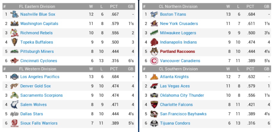 Raccoons (71-72) @ Loggers (78-65) – September 11-13, 2057