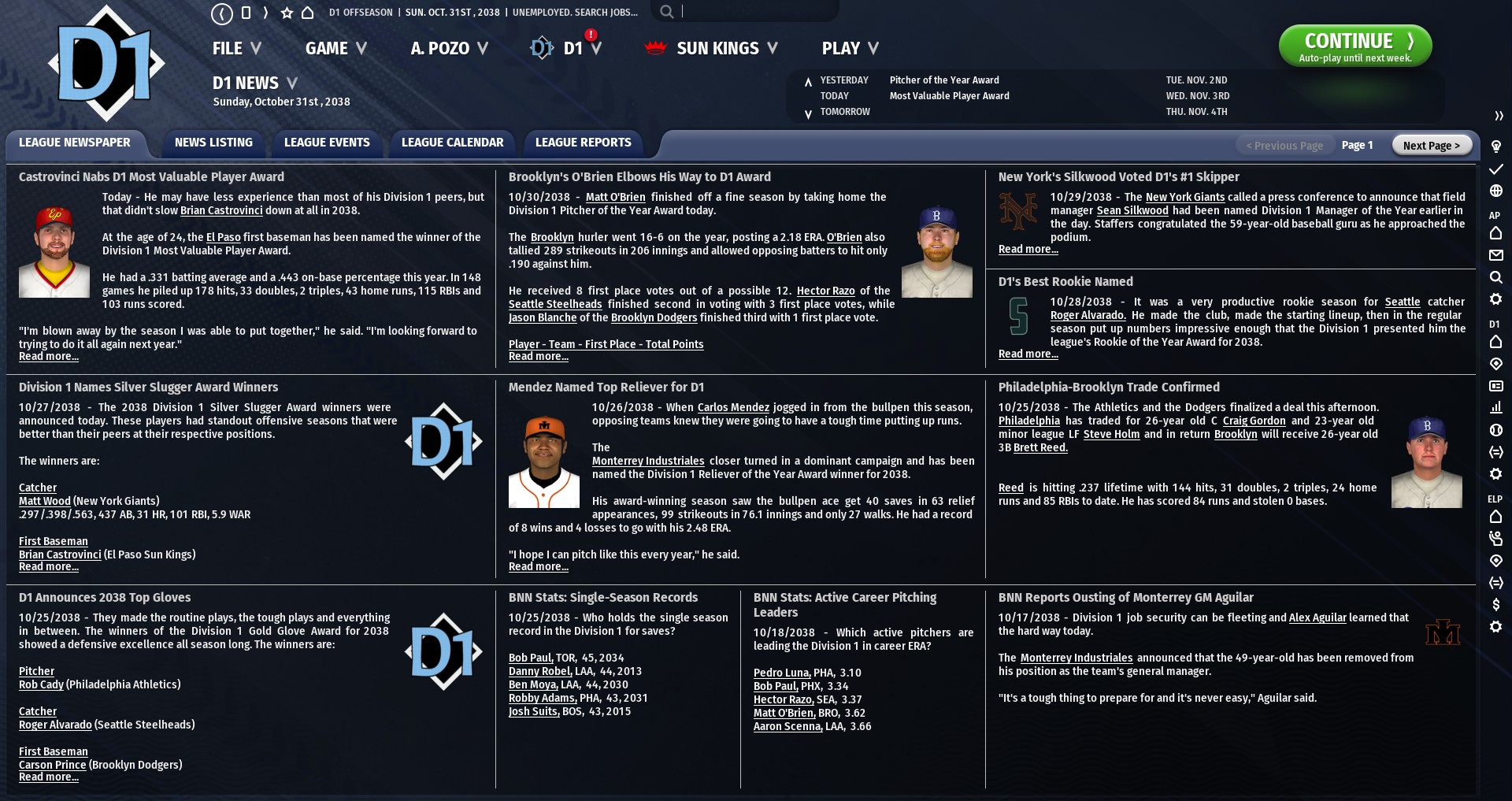 A clear, unanimous choice - Castrovinci announced himself as the next big star of the NABF this year with a massive campaign, nearly winning the Triple Crown while hitting 43 homers and driving in 115 runs in his first full season at age 24. He was easily the driving force behind El Paso’s championship season, and even won the Championship Series MVP. The sky is the limit for him. Pitcher of the Year: Matt O’Brien, SP, Brooklyn Dodgers Though it was his teammate Blanche who ultimately set the single season strikeout mark, O’Brien was actually ahead of him on that leaderboard at the time of his season-ending injury in late August. O’Brien had a remarkable breakout season in 2038, which would have been even greater had he remained healthy. Despite setting the all-time NABF strikeout mark as well as the D1 single-season WAR mark and leading the Division in FIP, Jason Blanche somehow got just a single first place vote. Rookie of the Year: Roger Alvarado, C, Seattle Steelheads Another clear choice. Alvarado has announced himself as the successor to D1’s great catchers Matt Wood and Mike Kepler, with a season that eclipsed them both. Not only did Alvarado burst onto the scene with 32 homers - a rookie catcher record - but he also took home a Gold Glove in his first season. Reliever of the Year: Carlos Mendez, CL, Monterrey Industriales Mendez saved 40 for a club that hovered around the .500 mark all season, striking out 31.3% of his batters while using his outstanding fastball/circle change combo to keep the ball on the ground. Silver Sluggers: C - Matt Wood, NYG 1B - Brian Castrovinci, ELP 2B - Andrew Fitts, NYG 3B - Josiah Morgan, PHA SS - Matt Galante, SEA LF - Dane Best, BRO CF - Benni Phillips, TOR RF - Mike Hood, SEA DH: Clemens Young, DEN Gold Gloves: P - Rob Cady, PHA C - Roger Alvarado, SEA 1B - Carson Prince, BRO 2B - Seth LaBarr, TIJ 3B - Perry Copenhaver, CHI SS - Mike Burcham, NYG LF - Jason Burditt, MRY CF - Joel Gamble, MRY RF - Mike Hood, SEA Batting Leaders Batting Title - Aaron Soucy, TMP: .337 Home Run Title - Donovan Bryant, DEN; Brian Castrovinci, ELP; Carson Prince, BRO: 43 RBI Title - Brian Castrovinci, ELP: 115 Stolen Base Title - Joe Rison, ELP: 44 On Base Percentage Title - Brian Castrovinci, ELP: .443 WAR Title - Brian Castrovinci, ELP: 8.3 Pitching Leaders Wins Title - Jeff Baltimore, SEA; Doug Kluz, LAA: 20 Strikeouts Title - Jason Blanche, BRO: 337*^ ERA Title - Matt O’Brien, BRO: 2.18 FIP Title - Jason Blanche, BRO: 2.42 Saves Title - Carlos Mendez, MRY: 40 WAR Title - Jason Blanche, BRO: 8.8* *represents Division record ^represents all-time NABF record Last edited by ArquimedezPozo; 02-23-2023 at 11:12 PM. |