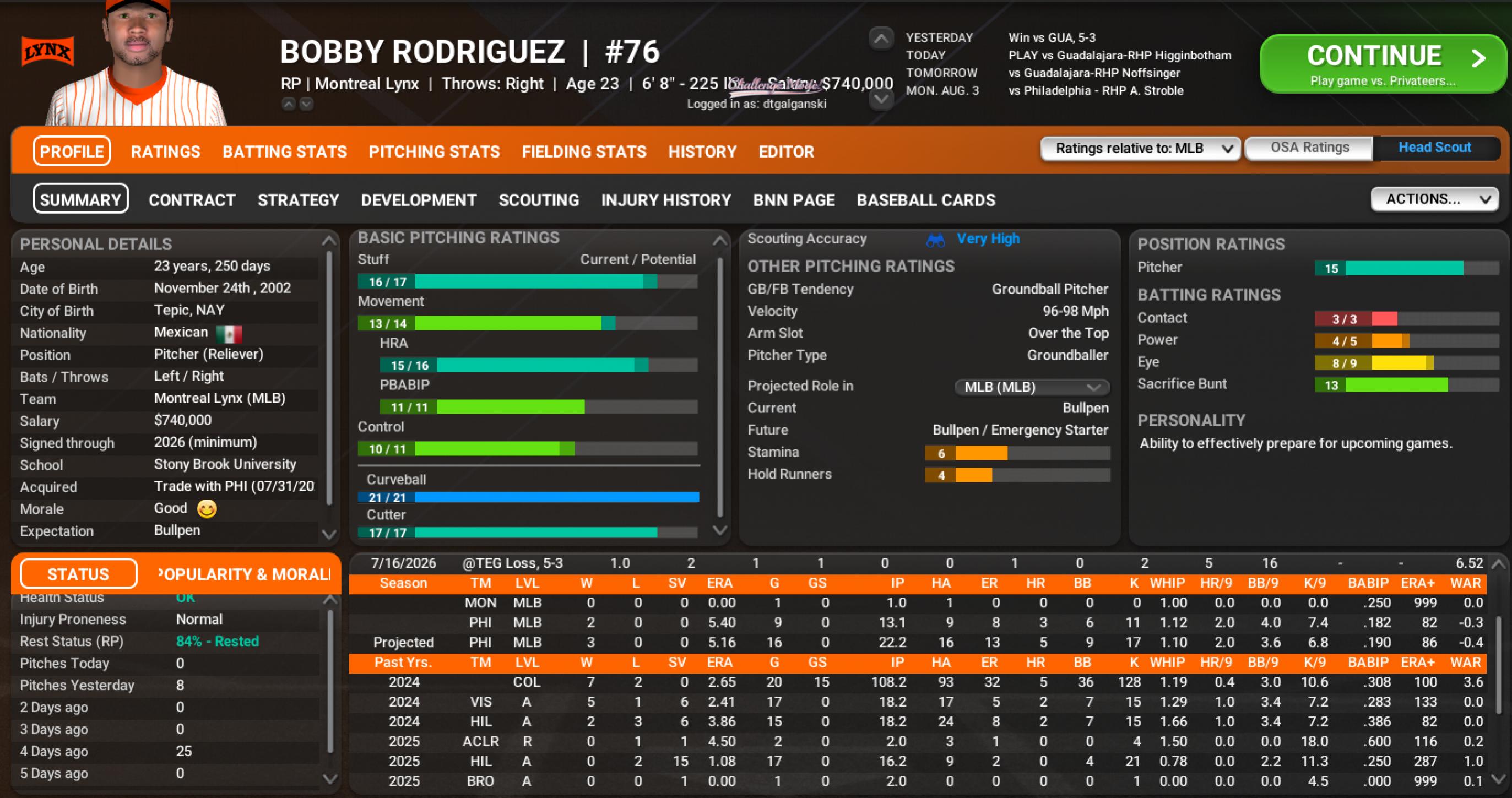 But the 31st is not the only day in the month. July 1 sees the tabbies start the month off against a weak Calgary team at home. After two 3-2 W's, we fail to finish the sweep. 2-1 Two 4 game series on the road follows. One against divisional rival Mississauga and the next against Guatemala. By the end, we have deja vous, losing the first two in both series before winning the last two in both series, splitting each and the road trip itself. 4-4 Mississauga follow us home for the next series, this one only three games. We take the first and last, taking the series. 2-1 Next up, Los Angeles comes into town. The last series before the AS break. The sub .500 team catches us flat footed, sweeping us at home and giving the boys plenty to think about. Only two tabbies make the AS lineup, our two stars in English & Buck, both playing good ball after their new contracts which is always nice to see. Buck has 1.1 WAR above the next AS, making the Cy Young his to lose in the second half. Games continue a few days later with a roadtrip against our rival this year for the divisional crown, Managua. The four game series sees no movement in the end though CL Rodriguez does blow his third game of the season. 2-2 Two in Toronto is up next. We drop the first but take the next. 1-1 Deadline day series sees Chicago visiting us. It's been a month of waffling in and out of .500 ball. Yet, we sweep the sub .500 War Eagles, capping the last game of the month off with 7 innings of no run ball by Buck, enough to earn him his 11th win on the season. 3-0 It also puts us above .500 for the month. We go 14-12 Originally, we were gonna sit tight. Then, we saw former SP Willie Asenjo on waivers. Claimed. Then, we thought to see if Gibson had any interest after a Pitcher of the Month month. He did. We trade him for RH bat Danny Martinez, a plus power hitter with a great eye. He'll slot in cleanup though he's a rental. We get another rental opp right before deadline day is ending. This time for a reliever we can't say no to. Our CL Rodriguez is having a banner year but Escalante is easily already a top 3 CL in the game. He's on a walk year but all we give up is Marrero who we picked up in late FA and a ~350 prospect OF. It's 'Win Now' mentality. Marrero, who we picked up to replace the injured Grizz would have found himself on the bench anyhow with Grizz coming back in a few days. Not bad biz. Gibson did great by the club, going 42-25 here and he was a key piece in our WS win two years ago. He's regressed but his stats this year have been strong. We'll follow his career with fondness and see where he lands when his contract is up in a year and a half. Also, with the Gibson trade, we should have enough $$ to sign Martinez, Escalante, or McWilliams-- whom the Front Office is leaning toward. We'll see. Last edited by dgally; 10-03-2024 at 12:38 AM. Reason: Gibson stats |